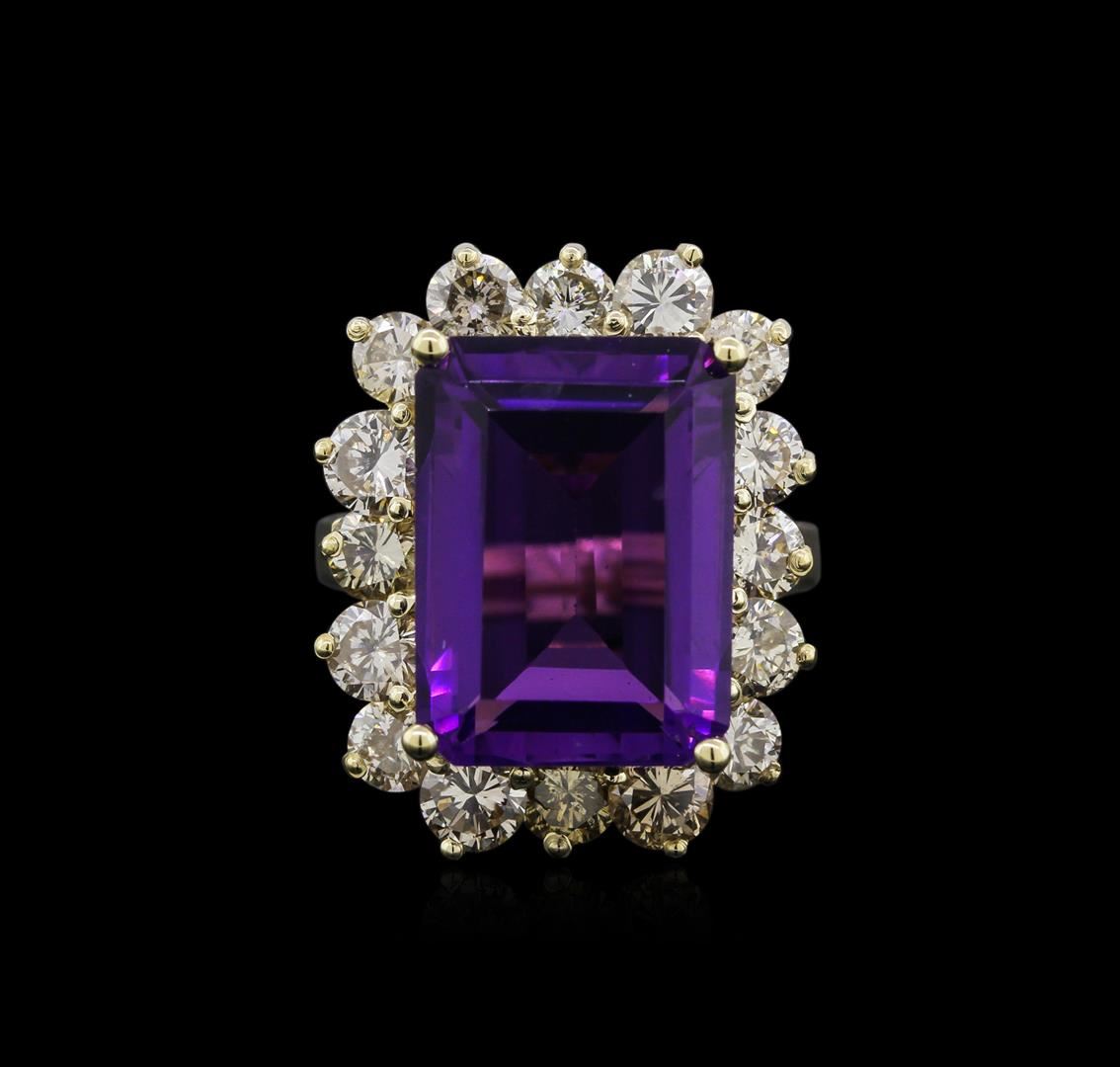 One electronically tested 14KT yellow gold ladies cast amethyst and diamond ring with a cathedral shank with a bright polish finish. Identified with markings of "K14". Condition is new. Containing: One prong set emerald modified step cut natural amethyst, measuring 16.17 x 11.93 x 7.60mm, approximate weight of 10.53ct., clarity is eye clean, type II, medium, moderately strong, purple color, (GIA P 5/4), cut is good. Sixteen prong set round brilliant cut diamonds, measuring 3.80 - 3.80 x 2.28mm (depth est.) approximate total weight of 16 Stones = 3.21ct. Clarity: I-1 to I-2. Color: L - M, Cut is Good. Diamonds and colored gemstones are graded in the mounting, unless otherwise stated. Colored gemstones are presumed to have been subjected to commonly used enhancement processes. Total Weight of Colored Stones 10.53ct. Total Weight of Diamonds 3.21ct. Total Weight of Ring 10.50 grams. GGL Appraised at $4,960.00.