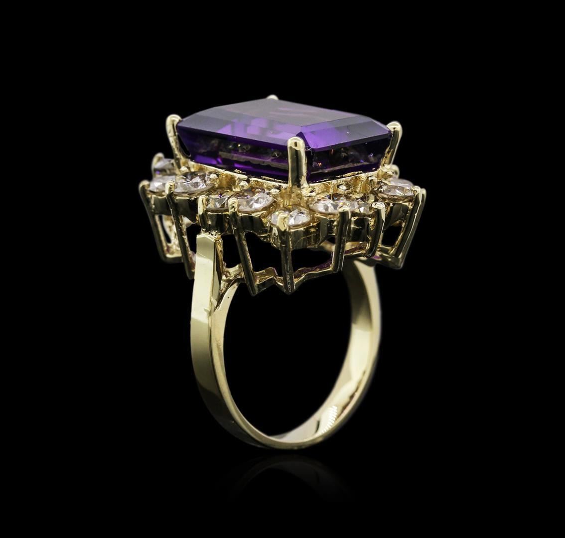 One electronically tested 14KT yellow gold ladies cast amethyst and diamond ring with a cathedral shank with a bright polish finish. Identified with markings of "K14". Condition is new. Containing: One prong set emerald modified step cut natural amethyst, measuring 16.17 x 11.93 x 7.60mm, approximate weight of 10.53ct., clarity is eye clean, type II, medium, moderately strong, purple color, (GIA P 5/4), cut is good. Sixteen prong set round brilliant cut diamonds, measuring 3.80 - 3.80 x 2.28mm (depth est.) approximate total weight of 16 Stones = 3.21ct. Clarity: I-1 to I-2. Color: L - M, Cut is Good. Diamonds and colored gemstones are graded in the mounting, unless otherwise stated. Colored gemstones are presumed to have been subjected to commonly used enhancement processes. Total Weight of Colored Stones 10.53ct. Total Weight of Diamonds 3.21ct. Total Weight of Ring 10.50 grams. GGL Appraised.