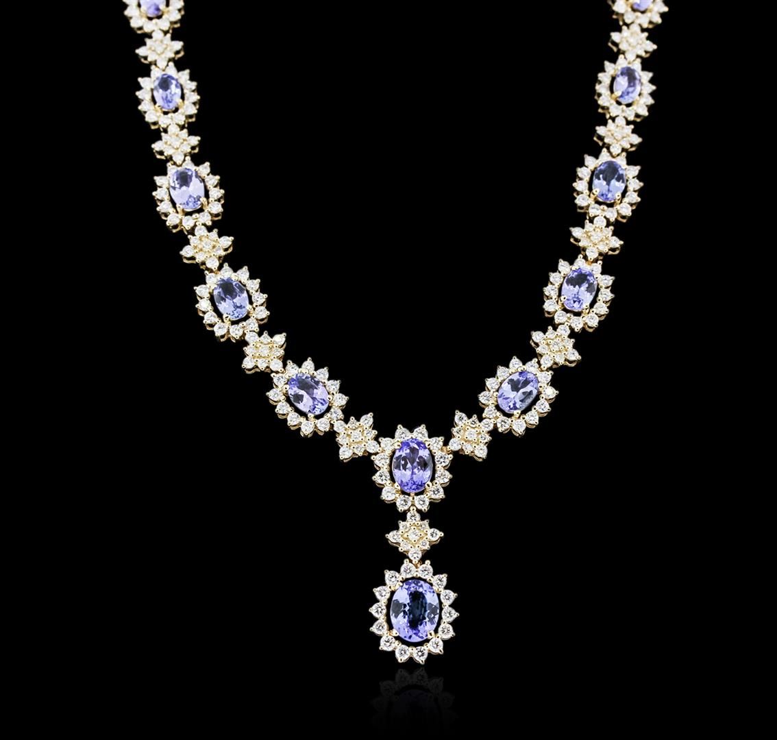 One electronically tested 14KT yellow gold ladies cast tanzanite and diamond necklace with a hidden box clasp with safety closer with a bright polish finish. Measurements: 16.50" in length Identified with markings of "14K". Condition is new. Containing: One prong set oval modified brilliant cut natural tanzanite, measuring 9.00 x 6.50 x 4.23mm, approximate weight of 1.74ct., clarity is eye clean, type I, medium, very slightly grayish, violet color, (GIA V 5/3), cut is good. Eleven prong set oval modified brilliant cut natural tanzanites, measuring 7.00 x 5.00 x 3.25mm, approximate total weight of 8.80ct., clarity is eye clean, type I, medium light, very slightly grayish, violet color, (GIA V 4/3), cut is good. Two Hundred Sixty-Three prong set round brilliant cut diamonds, measuring 2.00 - 1.60 x 1.08mm (depth est.) approximate total weight of 263 Stones = 5.60ct. Clarity: SI-1 to SI-2. Color: I - J, Cut is Good. Colored gemstones are presumed to have been subjected to commonly used enhancement processes. All diamonds and colored gemstones are graded in the mounting, unless otherwise stated. Total Weight of Colored Stones 10.54ct. Total Weight of Diamonds 5.60ct. Total Weight of Necklace 27.70 grams. GGL Appraised at $20,875.00.