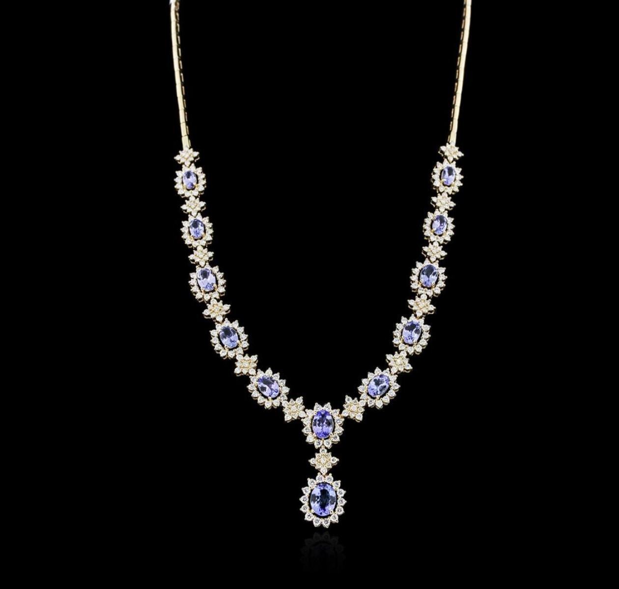One electronically tested 14KT yellow gold ladies cast tanzanite and diamond necklace with a hidden box clasp with safety closer with a bright polish finish. Measurements: 16.50" in length Identified with markings of "14K". Condition is new. Containing: One prong set oval modified brilliant cut natural tanzanite, measuring 9.00 x 6.50 x 4.23mm, approximate weight of 1.74ct., clarity is eye clean, type I, medium, very slightly grayish, violet color, (GIA V 5/3), cut is good. Eleven prong set oval modified brilliant cut natural tanzanites, measuring 7.00 x 5.00 x 3.25mm, approximate total weight of 8.80ct., clarity is eye clean, type I, medium light, very slightly grayish, violet color, (GIA V 4/3), cut is good. Two Hundred Sixty-Three prong set round brilliant cut diamonds, measuring 2.00 - 1.60 x 1.08mm (depth est.) approximate total weight of 263 Stones = 5.60ct. Clarity: SI-1 to SI-2. Color: I - J, Cut is Good. Colored gemstones are presumed to have been subjected to commonly used enhancement processes. All diamonds and colored gemstones are graded in the mounting, unless otherwise stated. Total Weight of Colored Stones 10.54ct. Total Weight of Diamonds 5.60ct. Total Weight of Necklace 27.70 grams. GGL Appraised.