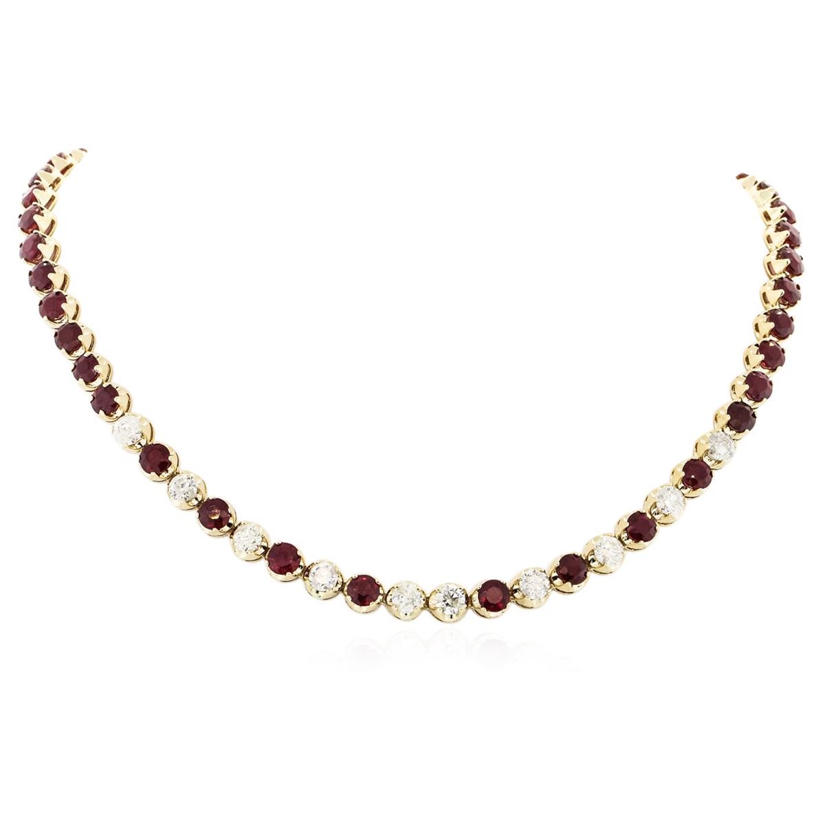 One electronically tested 14KT yellow gold ladies combination cast & assembled necklace with a hidden box clasp with a bright polish finish. Measurements: 17.5" in length. Identified with markings of "14K". Condition is new. Containing: Forty-eight prong set round modified brilliant cut natural rubies, measuring 5.50 - 5.50 x 3.58 mm, approximate total weight of 10.56ct., clarity is heavily included, medium dark, moderately strong, strongly purplish red color, (GIA stpR 6/4), cut is good. Ten prong set round brilliant cut diamonds, measuring 5.50 - 5.20 x 3.21mm (depth est.) approximate total weight of 10 Stones = 5.60ct. Clarity: I-2. Color: I, Cut is Good. Colored gemstones are presumed to have been subjected to commonly used enhancement processes. All diamonds and colored gemstones are graded in the mounting, unless otherwise stated. Total Weight of Colored Stones 10.56ct. Total Weight of Diamonds 5.60ct. Total Weight of Necklace 50.80 grams. GGL Appraised at $21,040.00.