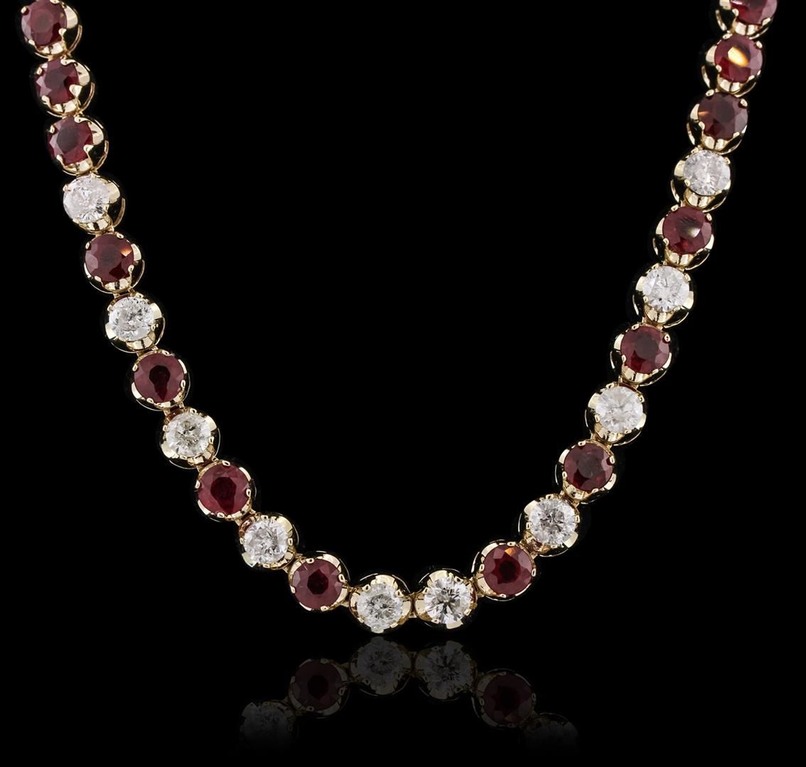 One electronically tested 14KT yellow gold ladies combination cast & assembled necklace with a hidden box clasp with a bright polish finish. Measurements: 17.5" in length. Identified with markings of "14K". Condition is new. Containing: Forty-eight prong set round modified brilliant cut natural rubies, measuring 5.50 - 5.50 x 3.58 mm, approximate total weight of 10.56ct., clarity is heavily included, medium dark, moderately strong, strongly purplish red color, (GIA stpR 6/4), cut is good. Ten prong set round brilliant cut diamonds, measuring 5.50 - 5.20 x 3.21mm (depth est.) approximate total weight of 10 Stones = 5.60ct. Clarity: I-2. Color: I, Cut is Good. Colored gemstones are presumed to have been subjected to commonly used enhancement processes. All diamonds and colored gemstones are graded in the mounting, unless otherwise stated. Total Weight of Colored Stones 10.56ct. Total Weight of Diamonds 5.60ct. Total Weight of Necklace 50.80 grams. GGL Appraised at $21,040.00.