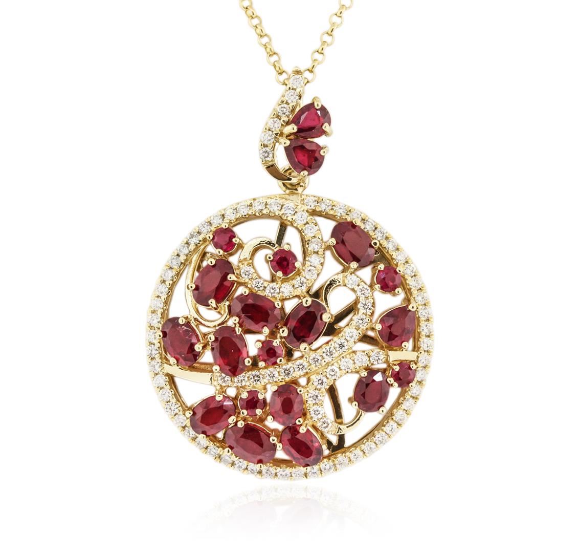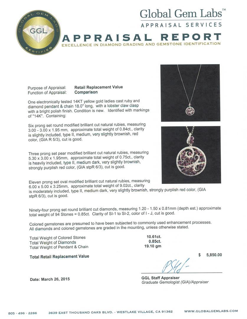 One electronically tested 14KT yellow gold ladies cast ruby and diamond pendant & chain 18.0" long, with a lobster claw clasp with a bright polish finish. Identified with markings of "14K". Condition is new. Containing: Six prong set round modified brilliant cut natural rubies, measuring 3.00 - 3.00 x 1.95 mm, approximate total weight of 0.84ct., clarity is slightly included, type II, medium, very slightly brownish, red color, (GIA R 5/3), cut is good. Three prong set pear modified brilliant cut natural rubies, measuring 5.30 x 3.00 x 1.95mm, approximate total weight of 0.75ct., clarity is heavily included, type II, medium dark, very slightly brownish, strongly purplish red color, (GIA stpR 6/3), cut is good. Eleven prong set oval modified brilliant cut natural rubies, measuring 6.00 x 5.00 x 3.25mm, approximate total weight of 9.02ct., clarity is moderately included, type II, medium dark, very slightly brownish, strongly purplish red color, (GIA stpR 6/3), cut is good. Ninety-Four prong set round brilliant cut diamonds, measuring 1.20 - 1.50 x 0.81mm (depth est.) approximate total weight of 94 Stones = 0.85ct. Clarity: SI-1 to SI-2. Color: I - J, Cut is Good. Colored gemstones are presumed to have been subjected to commonly used enhancement processes. All diamonds and colored gemstones are graded in the mounting, unless otherwise stated. Total Weight of Colored Stones 10.61ct. Total Weight of Diamonds 0.85ct. Total Weight of Pendant & Chain 19.10 grams. GGL Appraised at $5,850.00.