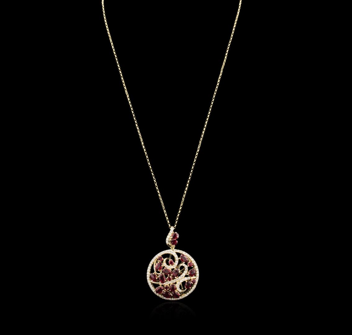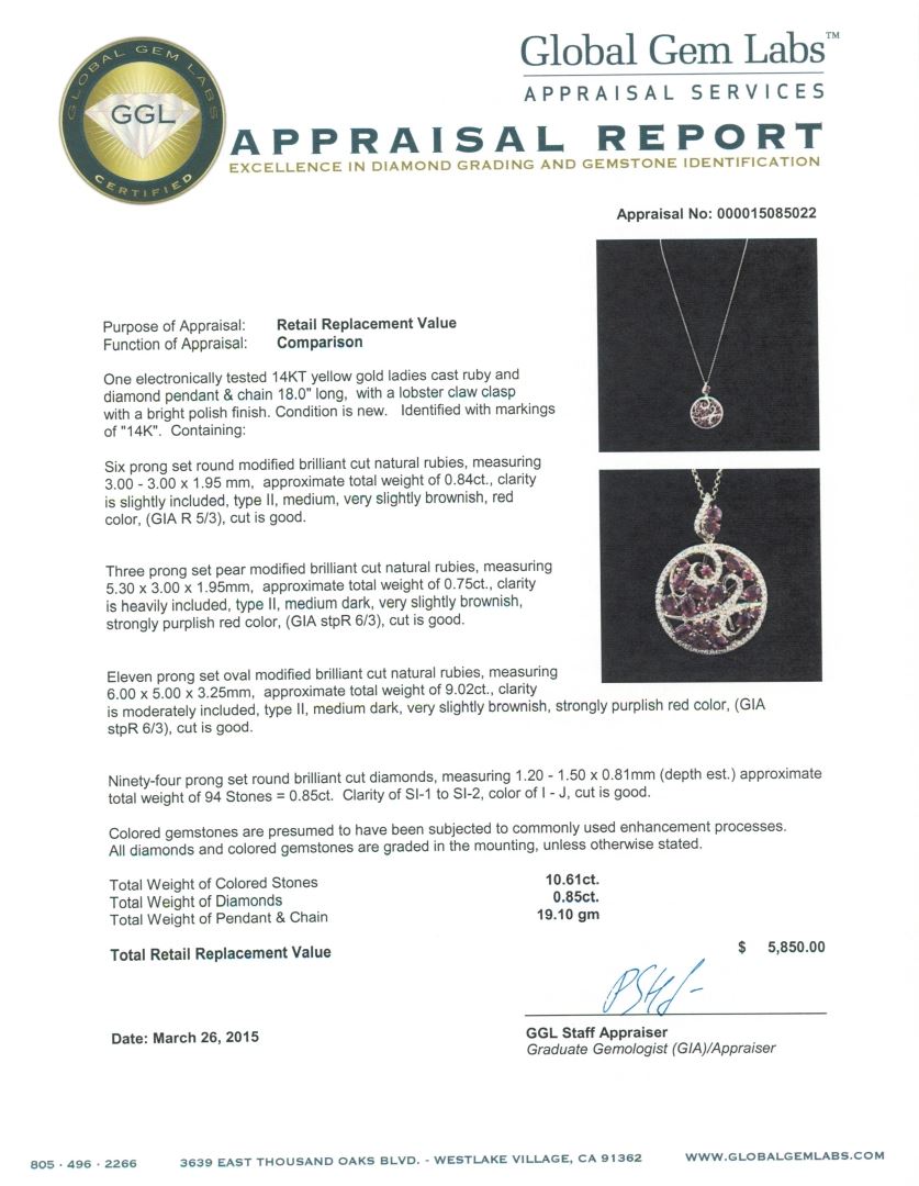 One electronically tested 14KT yellow gold ladies cast ruby and diamond pendant & chain 18.0" long, with a lobster claw clasp with a bright polish finish. Identified with markings of "14K". Condition is new. Containing: Six prong set round modified brilliant cut natural rubies, measuring 3.00 - 3.00 x 1.95 mm, approximate total weight of 0.84ct., clarity is slightly included, type II, medium, very slightly brownish, red color, (GIA R 5/3), cut is good. Three prong set pear modified brilliant cut natural rubies, measuring 5.30 x 3.00 x 1.95mm, approximate total weight of 0.75ct., clarity is heavily included, type II, medium dark, very slightly brownish, strongly purplish red color, (GIA stpR 6/3), cut is good. Eleven prong set oval modified brilliant cut natural rubies, measuring 6.00 x 5.00 x 3.25mm, approximate total weight of 9.02ct., clarity is moderately included, type II, medium dark, very slightly brownish, strongly purplish red color, (GIA stpR 6/3), cut is good. Ninety-Four prong set round brilliant cut diamonds, measuring 1.20 - 1.50 x 0.81mm (depth est.) approximate total weight of 94 Stones = 0.85ct. Clarity: SI-1 to SI-2. Color: I - J, Cut is Good. Colored gemstones are presumed to have been subjected to commonly used enhancement processes. All diamonds and colored gemstones are graded in the mounting, unless otherwise stated. Total Weight of Colored Stones 10.61ct. Total Weight of Diamonds 0.85ct. Total Weight of Pendant & Chain 19.10 grams. GGL Appraised at $5,850.00.