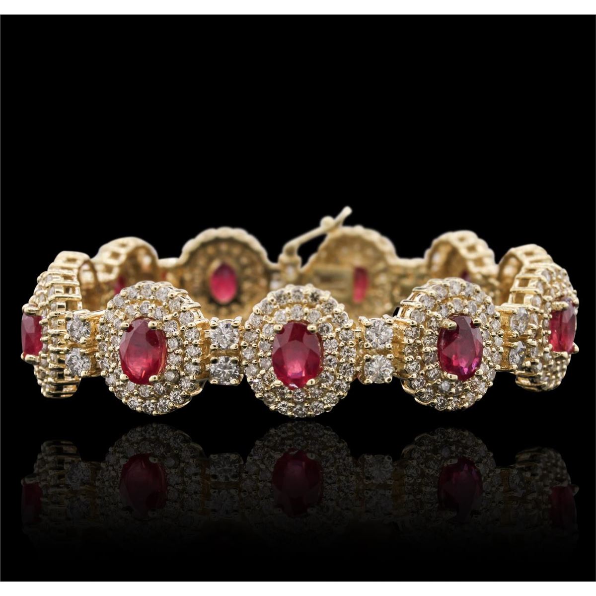 One electronically tested 14KT yellow gold ladies cast & assembled ruby and diamond bracelet with a bright polish finish. Condition is new, good workmanship. Seven inch length bracelet features a ribbon of ruby and diamond bezels, alternated by diamond duos, terminating in a concealed clasp with safety clasp. Identified with markings of "14K". Containing: Eleven prong set oval mixed cut natural rubies, measuring 7.00 x 5.00 x 3.25mm, 6%. bulge factor, approximate. Total Weight of 10.89ct., clarity is heavily included, type II, medium dark, moderately strong, slightly purplish red color, (GIA slpR 6/4), cut is good. Transmitting light somewhat diffusely, transparent to translucent. Naturally occurring internal & external characteristics are present. Indications of laboratory high temperature heat treatment, with glass & flux additives. Measurements & the color grade are an average for the group. Graded in the setting. Ruby has a low tolerance to rhodium plating, repolishing the surface, & ultrasonic cleaning. Twenty-Two prong set round brilliant cut diamonds, measuring 3.20 - 3.10 x 1.89mm (depth est.) approximate. Total Weight of 22 Stones = 2.61ct. Graded in the setting. Clarity: I-1 to I-3. Color: G - I Three Hundred Seventy-Four prong set round brilliant cut diamonds, measuring 1.80 - 1.60 x 1.02mm (depth est.) approximate. Total Weight of 374 Stones = 6.79ct. Faint brown and yellow secondary color throughout. Graded in the setting. Clarity: SI-2 to I-2. Color: J - M. Total Weight of Colored Stones 10.89ct. Total Weight of Diamonds 9.40ct. Total Weight of Bracelet 38.40 grams. AIG Appraised at $26,000.00.