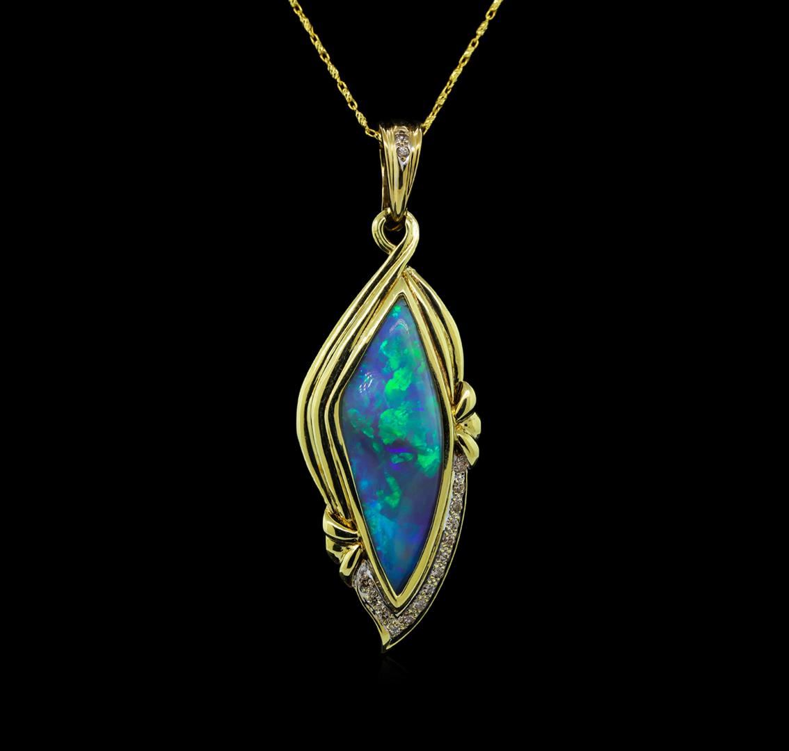 One electronically tested 14KT yellow gold ladies cast opal & diamond pendant with chain. The seventeen inch length one millimeter wide designer style chain supports a freeform marquise shape opal and diamond pendant. Identified with markings of "14K 585". Condition is good. Containing: One crystal opal that is cut in a marquise shaped cabochon and is bezel set, measuring 32.00 mm long x 12.00 mm wide, and 5.90 mm thick and the approximate weight is 11.00 carats. The opal has a bright, blue-green play of color (fire) in a flashfire pattern; a medium dome; a good cut; slightly included; minor dull spot in its brightness and pattern; and is somewhat directional. Some crazing has occurred. Graded in the setting. Sixteen bright cut & bead set round brilliant cut diamonds, measuring 1.50 - 1.40 x 0.87mm (depth est.) approximate total weight of 16 Stones = 0.18ct. Graded in the setting. Clarity: SI-2 to I-1. Color: I - K. Total Weight of Diamonds 0.18ct. Total Weight of Opals 11.00ct. Total Weight of Pendant With Chain 11.12 grams. AIG Appraised at $4,350.00.