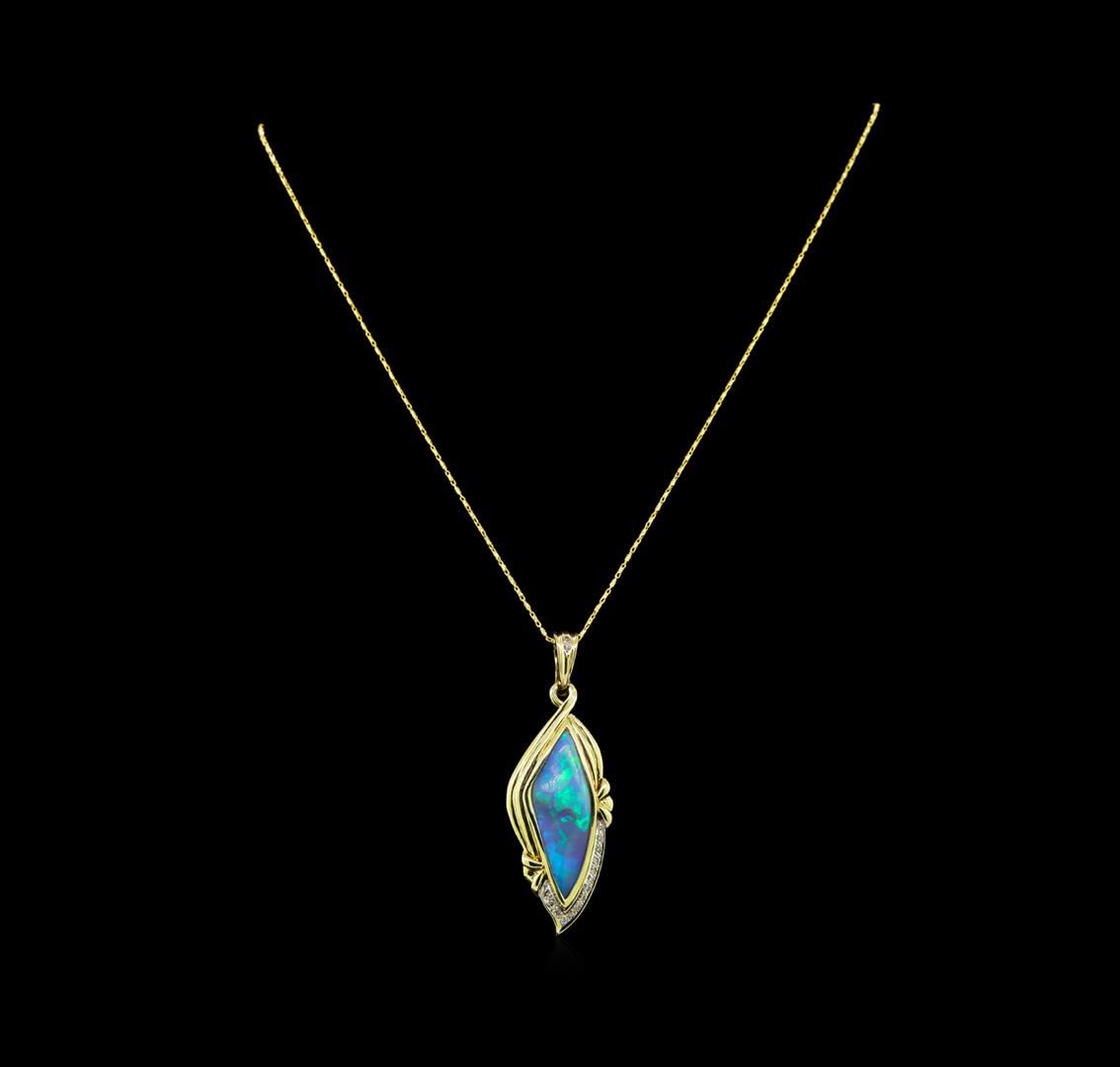 One electronically tested 14KT yellow gold ladies cast opal & diamond pendant with chain. The seventeen inch length one millimeter wide designer style chain supports a freeform marquise shape opal and diamond pendant. Identified with markings of "14K 585". Condition is good. Containing: One crystal opal that is cut in a marquise shaped cabochon and is bezel set, measuring 32.00 mm long x 12.00 mm wide, and 5.90 mm thick and the approximate weight is 11.00 carats. The opal has a bright, blue-green play of color (fire) in a flashfire pattern; a medium dome; a good cut; slightly included; minor dull spot in its brightness and pattern; and is somewhat directional. Some crazing has occurred. Graded in the setting. Sixteen bright cut & bead set round brilliant cut diamonds, measuring 1.50 - 1.40 x 0.87mm (depth est.) approximate total weight of 16 Stones = 0.18ct. Graded in the setting. Clarity: SI-2 to I-1. Color: I - K. Total Weight of Diamonds 0.18ct. Total Weight of Opals 11.00ct. Total Weight of Pendant With Chain 11.12 grams. AIG Appraised at $4,350.00.