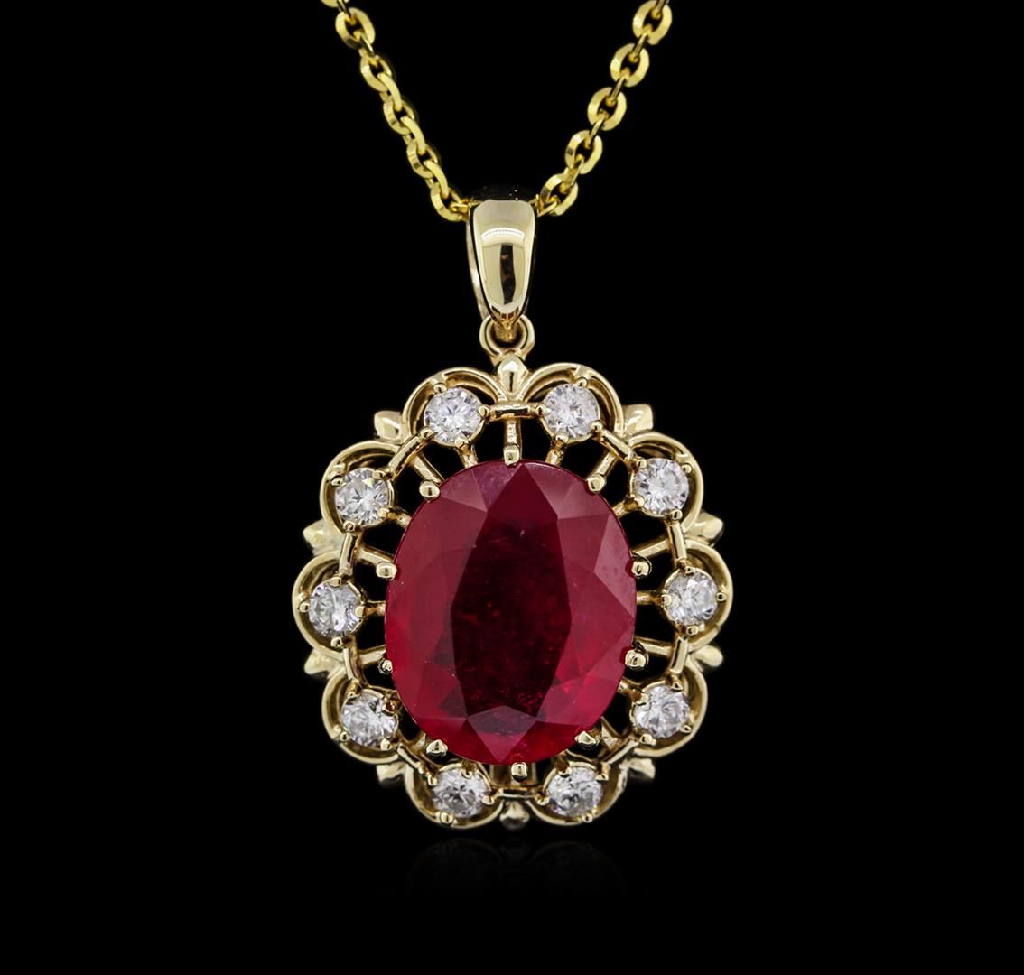 One electronically tested 14KT yellow gold ladies cast ruby and diamond pendant & chain 18.0" long, with a lobster claw clasp with a bright polish finish. Identified with markings of "14K". Condition is new. Containing: One prong set oval modified brilliant cut natural ruby, measuring 15.50 x 12.50 x 8.13mm, approximate weight of 11.11ct., clarity is heavily included, medium, moderately strong, purple red color, (GIA PR 5/4), cut is good. Ten prong set round brilliant cut diamonds, measuring 3.00 - 3.00 x 1.80mm (depth est.) approximate total weight of 10 Stones = 0.92ct. Clarity: SI-2 to I-1. Color: I - J, Cut is Good. Colored gemstones are presumed to have been subjected to commonly used enhancement processes. All diamonds and colored gemstones are graded in the mounting, unless otherwise stated. Total Weight of Colored Stones 11.11ct. Total Weight of Diamonds 0.92ct. Total Weight of Pendant & Chain 12.30 grams. GGL Appraised at $5,155.00.