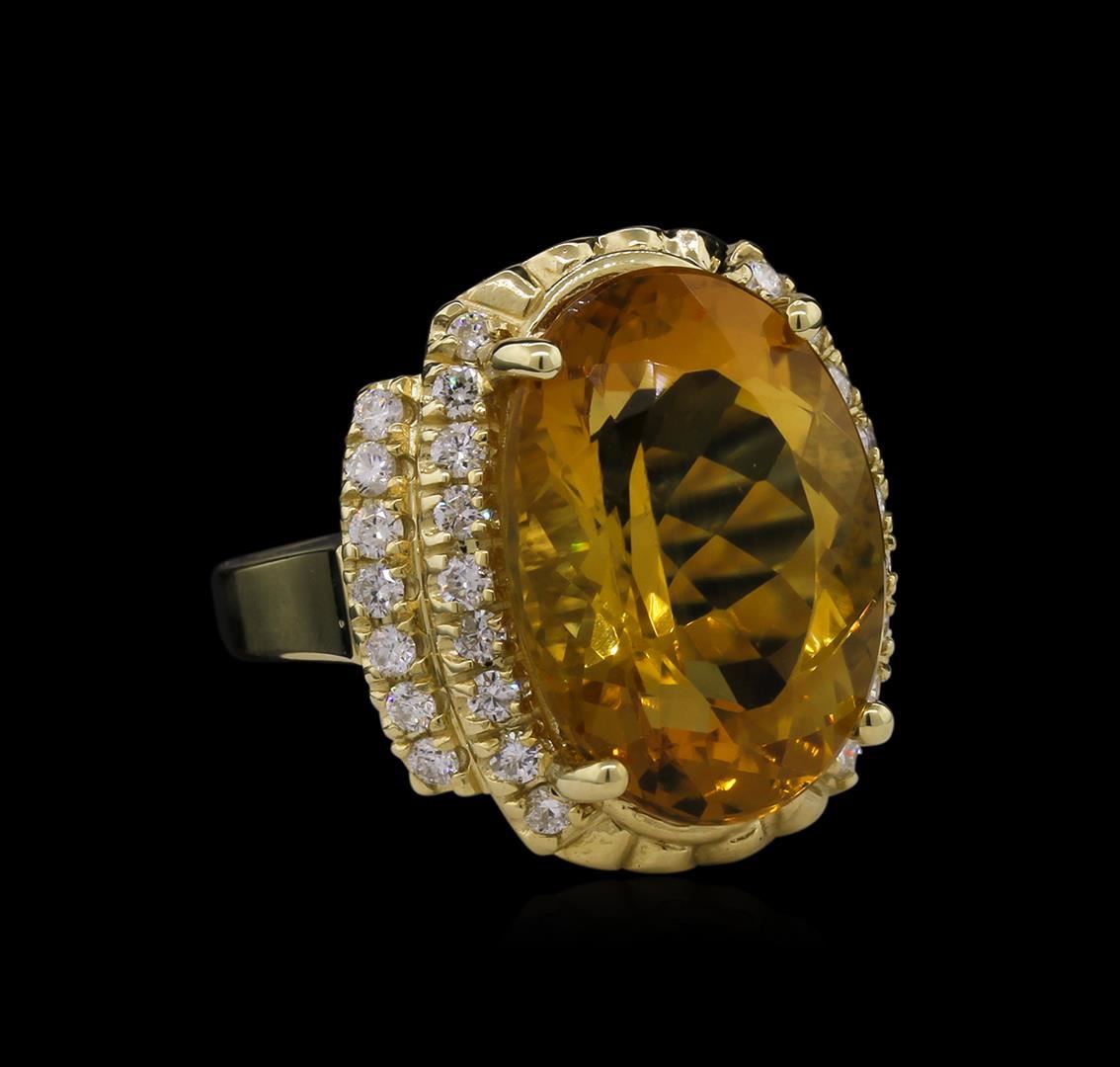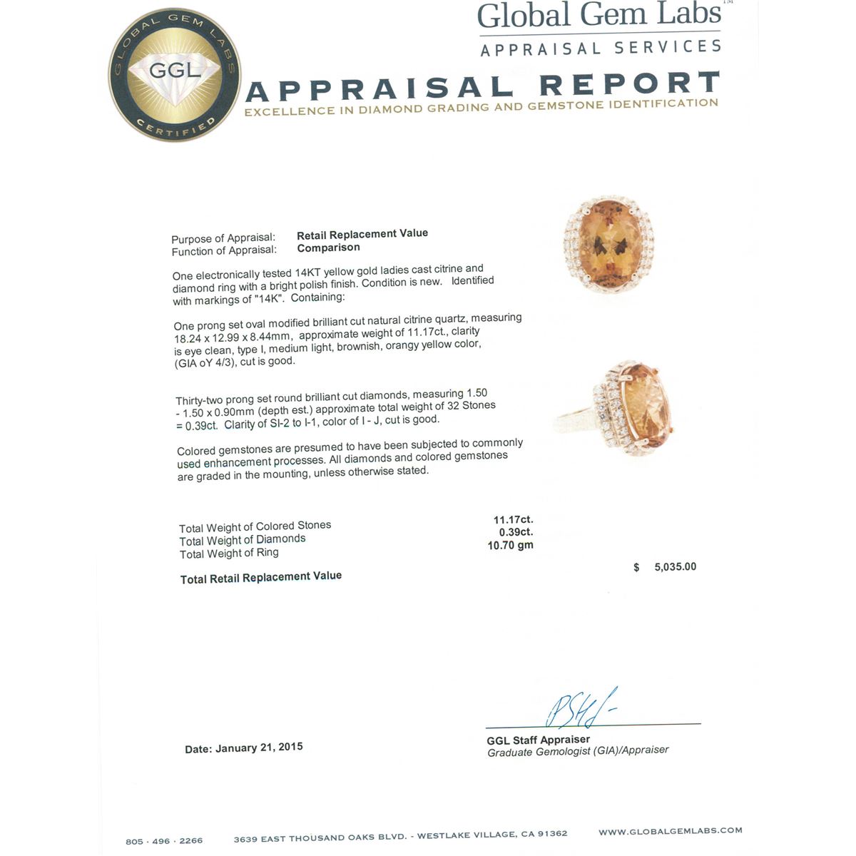 One electronically tested 14KT yellow gold ladies cast citrine and diamond ring with a bright polish finish. Identified with markings of "14K". Condition is new. Containing: One prong set oval modified brilliant cut natural citrine quartz, measuring 18.24 x 12.99 x 8.44mm, approximate weight of 11.17ct., clarity is eye clean, type I, medium light, brownish, orangy yellow color, (GIA oY 4/3), cut is good. Thirty-Two prong set round brilliant cut diamonds, measuring 1.50 - 1.50 x 0.90mm (depth est.) approximate total weight of 32 Stones = 0.39ct. Clarity: SI-2 to I-1. Color: I - J, Cut is Good. Colored gemstones are presumed to have been subjected to commonly used enhancement processes. All diamonds and colored gemstones are graded in the mounting, unless otherwise stated. Total Weight of Colored Stones 11.17ct. Total Weight of Diamonds 0.39ct. Total Weight of Ring 10.70 grams. GGL Appraised at $5,035.00.
