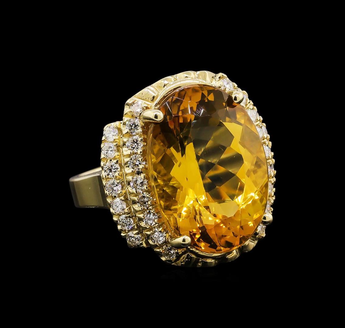 One electronically tested 14KT yellow gold ladies cast citrine and diamond ring with a bright polish finish. Identified with markings of "14K". Condition is new. Containing: One prong set oval modified brilliant cut natural citrine quartz, measuring 18.24 x 12.99 x 8.44mm, approximate weight of 11.17ct., clarity is eye clean, type I, medium light, brownish, orangy yellow color, (GIA oY 4/3), cut is good. Thirty-Two prong set round brilliant cut diamonds, measuring 1.50 - 1.50 x 0.90mm (depth est.) approximate total weight of 32 Stones = 0.39ct. Clarity: SI-2 to I-1. Color: I - J, Cut is Good. Colored gemstones are presumed to have been subjected to commonly used enhancement processes. All diamonds and colored gemstones are graded in the mounting, unless otherwise stated. Total Weight of Colored Stones 11.17ct. Total Weight of Diamonds 0.39ct. Total Weight of Ring 10.70 grams. GGL Appraised at $5,035.00.