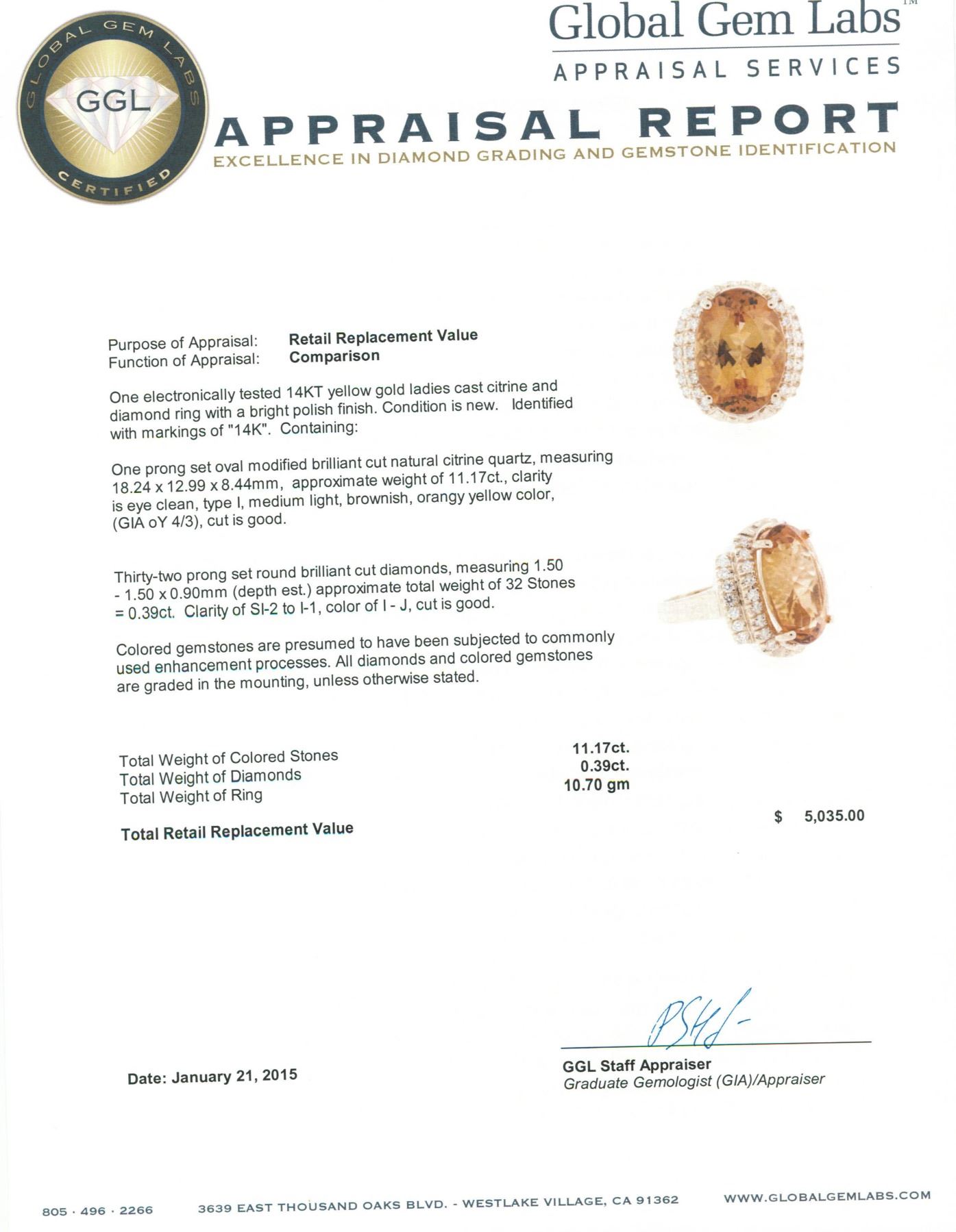 One electronically tested 14KT yellow gold ladies cast citrine and diamond ring with a bright polish finish. Identified with markings of "14K". Condition is new. Containing: One prong set oval modified brilliant cut natural citrine quartz, measuring 18.24 x 12.99 x 8.44mm, approximate weight of 11.17ct., clarity is eye clean, type I, medium light, brownish, orangy yellow color, (GIA oY 4/3), cut is good. Thirty-Two prong set round brilliant cut diamonds, measuring 1.50 - 1.50 x 0.90mm (depth est.) approximate total weight of 32 Stones = 0.39ct. Clarity: SI-2 to I-1. Color: I - J, Cut is Good. Colored gemstones are presumed to have been subjected to commonly used enhancement processes. All diamonds and colored gemstones are graded in the mounting, unless otherwise stated. Total Weight of Colored Stones 11.17ct. Total Weight of Diamonds 0.39ct. Total Weight of Ring 10.70 grams. GGL Appraised.
