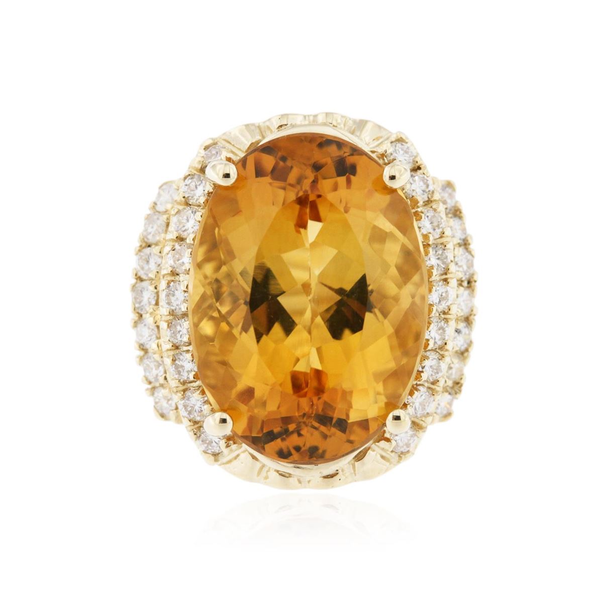 One electronically tested 14KT yellow gold ladies cast citrine and diamond ring with a bright polish finish. Identified with markings of "14K". Condition is new. Containing: One prong set oval modified brilliant cut natural citrine quartz, measuring 18.24 x 12.99 x 8.44mm, approximate weight of 11.17ct., clarity is eye clean, type I, medium light, brownish, orangy yellow color, (GIA oY 4/3), cut is good. Thirty-Two prong set round brilliant cut diamonds, measuring 1.50 - 1.50 x 0.90mm (depth est.) approximate total weight of 32 Stones = 0.39ct. Clarity: SI-2 to I-1. Color: I - J, Cut is Good. Colored gemstones are presumed to have been subjected to commonly used enhancement processes. All diamonds and colored gemstones are graded in the mounting, unless otherwise stated. Total Weight of Colored Stones 11.17ct. Total Weight of Diamonds 0.39ct. Total Weight of Ring 10.70 grams. GGL Appraised at $5,035.00.