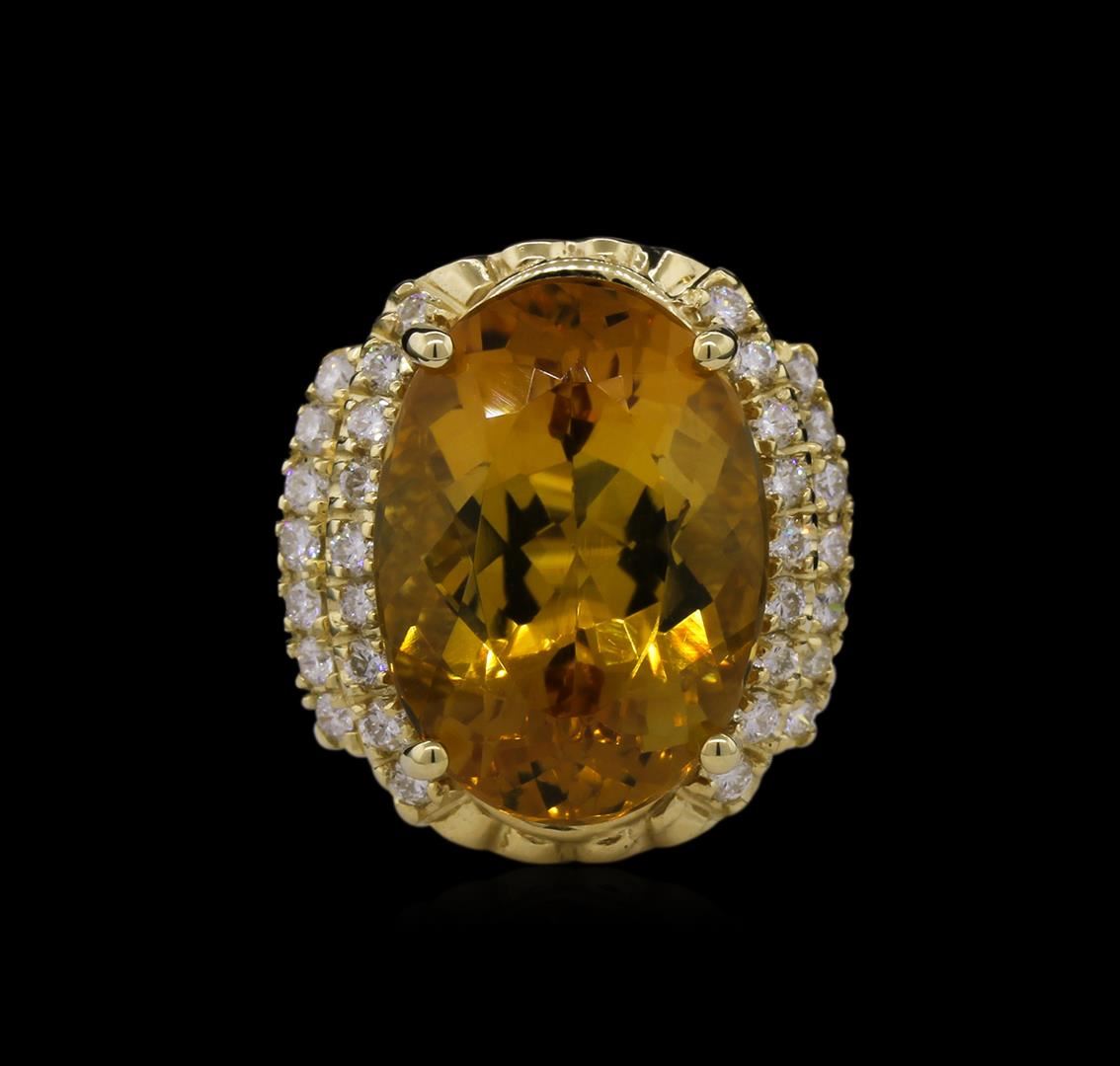 One electronically tested 14KT yellow gold ladies cast citrine and diamond ring with a bright polish finish. Identified with markings of "14K". Condition is new. Containing: One prong set oval modified brilliant cut natural citrine quartz, measuring 18.24 x 12.99 x 8.44mm, approximate weight of 11.17ct., clarity is eye clean, type I, medium light, brownish, orangy yellow color, (GIA oY 4/3), cut is good. Thirty-Two prong set round brilliant cut diamonds, measuring 1.50 - 1.50 x 0.90mm (depth est.) approximate total weight of 32 Stones = 0.39ct. Clarity: SI-2 to I-1. Color: I - J, Cut is Good. Colored gemstones are presumed to have been subjected to commonly used enhancement processes. All diamonds and colored gemstones are graded in the mounting, unless otherwise stated. Total Weight of Colored Stones 11.17ct. Total Weight of Diamonds 0.39ct. Total Weight of Ring 10.70 grams. GGL Appraised at $5,035.00.
