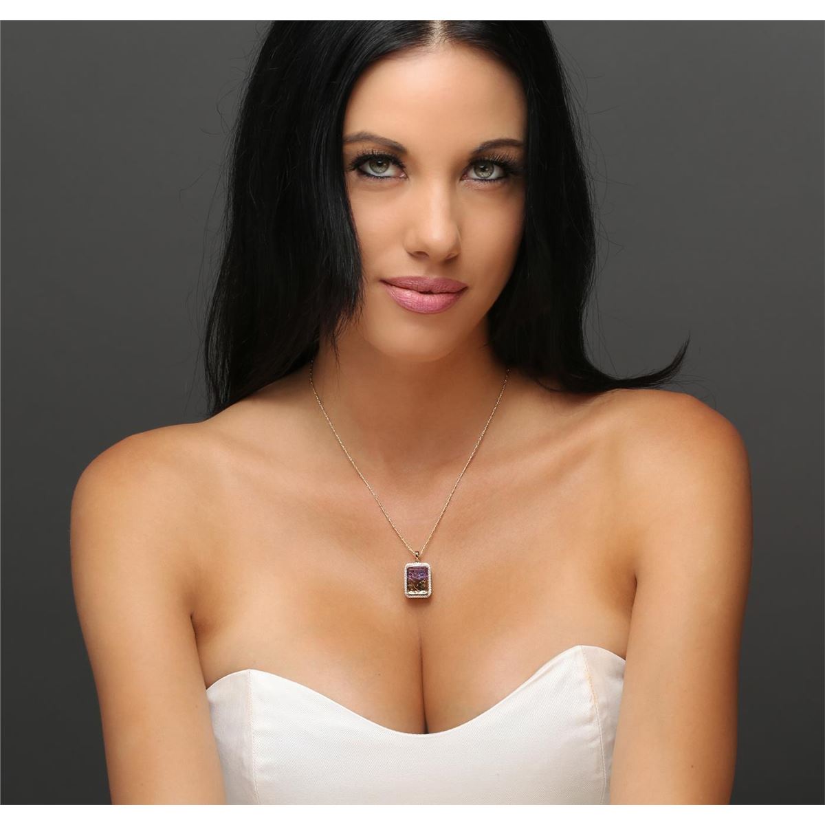 One electronically tested 14KT yellow gold ladies cast & assembled ametrine and diamond pendant with chain. The pendant features an ametrine set within a diamond bezel, completed by a yellow gold bail. The pendant is supported by an eighteen inch length 14KT yellow gold designer style chain, terminating in a lobster claw clasp. Bright polish finish. Identified with markings of "14K". Condition is new, good workmanship. Containing: One prong set rectangular mixed cut natural ametrine quartz, measuring 15.74 x 12.20 x 6.90mm, 6% bulge factor, approximate weight of 11.21ct., clarity is moderately included, type I, medium dark, very slightly grayish, purple color, (GIA P 6/3) to medium dark, brownish, orangy yellow, (GIA oY 6/3), cut is good. Transmitting light with a minimum of distortion, transparent. Naturally occurring internal & external characteristics are present. Colored Stone Grading Report attached. Graded in the setting. Forty-Four prong set round brilliant cut diamonds, measuring 1.30 - 1.20 x 0.75mm (depth est.) approximate total weight of 44 Stones = 0.41ct. Graded in the setting. Clarity: SI-2 to I-2. Color: G - I. Total Weight of Colored Stones 11.21ct. Total Weight of Diamonds 0.41ct. Total Weight of Pendant With Chain 8.03 grams. AIG Appraised at $2,580.00.