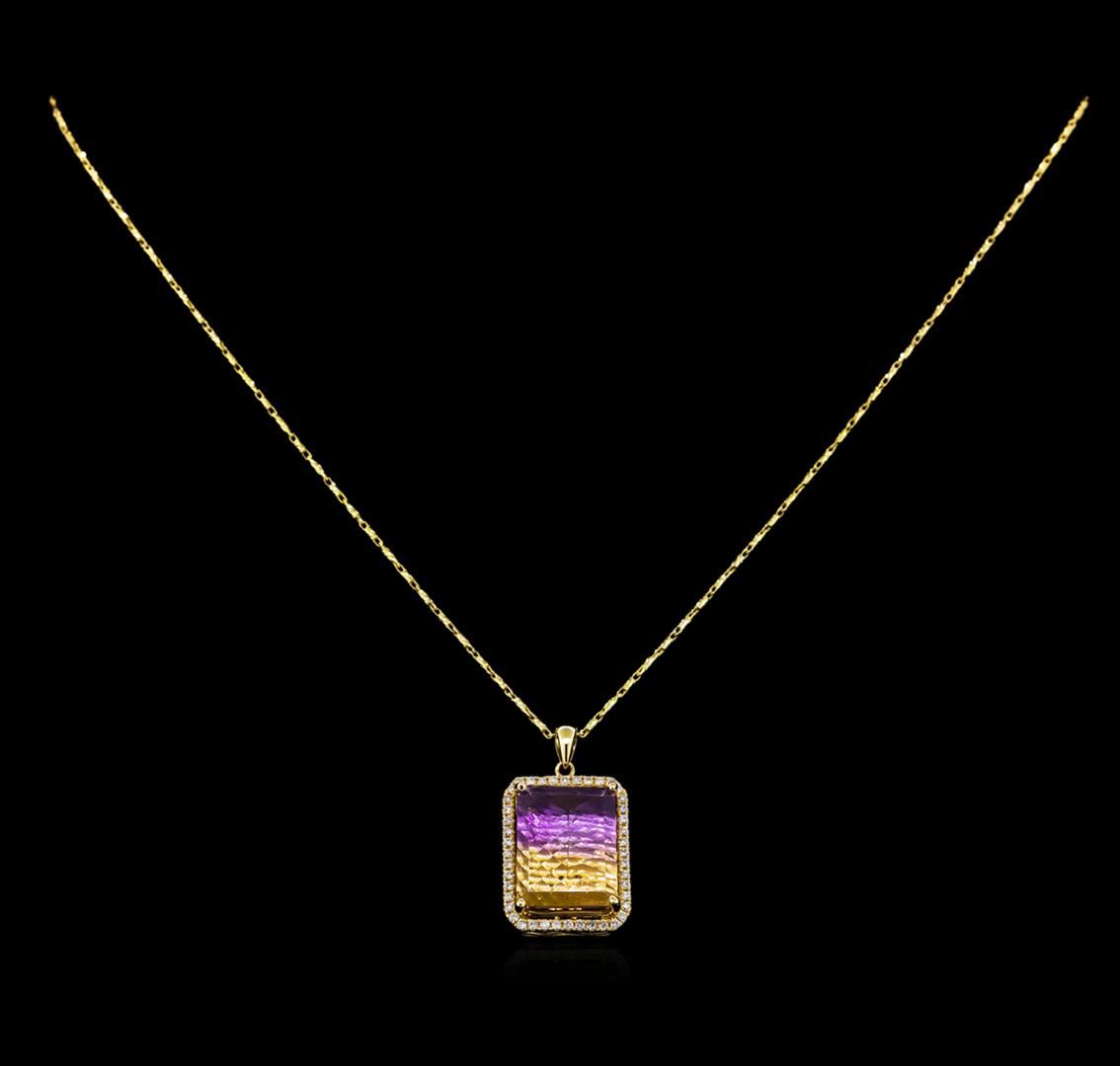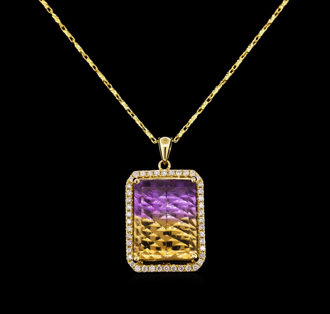 One electronically tested 14KT yellow gold ladies cast & assembled ametrine and diamond pendant with chain. The pendant features an ametrine set within a diamond bezel, completed by a yellow gold bail. The pendant is supported by an eighteen inch length 14KT yellow gold designer style chain, terminating in a lobster claw clasp. Bright polish finish. Identified with markings of "14K". Condition is new, good workmanship. Containing: One prong set rectangular mixed cut natural ametrine quartz, measuring 15.74 x 12.20 x 6.90mm, 6% bulge factor, approximate weight of 11.21ct., clarity is moderately included, type I, medium dark, very slightly grayish, purple color, (GIA P 6/3) to medium dark, brownish, orangy yellow, (GIA oY 6/3), cut is good. Transmitting light with a minimum of distortion, transparent. Naturally occurring internal & external characteristics are present. Colored Stone Grading Report attached. Graded in the setting. Forty-Four prong set round brilliant cut diamonds, measuring 1.30 - 1.20 x 0.75mm (depth est.) approximate total weight of 44 Stones = 0.41ct. Graded in the setting. Clarity: SI-2 to I-2. Color: G - I. Total Weight of Colored Stones 11.21ct. Total Weight of Diamonds 0.41ct. Total Weight of Pendant With Chain 8.03 grams. AIG Appraised at $2,580.00.