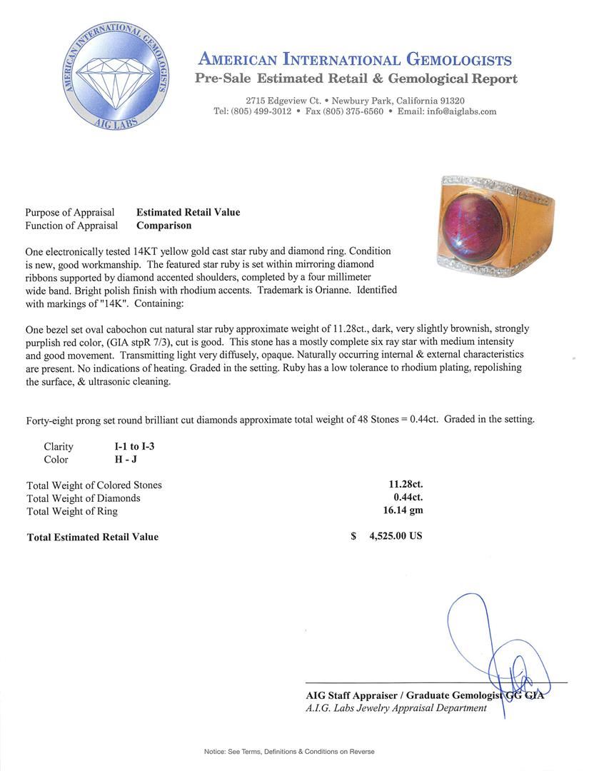 One electronically tested 14KT yellow gold cast star ruby and diamond ring. The featured star ruby is set within mirroring diamond ribbons supported by diamond accented shoulders, completed by a four millimeter wide band. Bright polish finish with rhodium accents. Trademark is Orianne. Identified with markings of "14K". Condition is new, good workmanship. Containing: One bezel set oval cabochon cut natural star ruby approximate weight of 11.28ct., dark, very slightly brownish, strongly purplish red color, (GIA stpR 7/3), cut is good. This stone has a mostly complete six ray star with medium intensity and good movement. Transmitting light very diffusely, opaque. Naturally occurring internal & external characteristics are present. No indications of heating. Graded in the setting. Ruby has a low tolerance to rhodium plating, repolishing the surface, & ultrasonic cleaning. Forty-Eight prong set round brilliant cut diamonds approximate total weight of 48 Stones = 0.44ct. Graded in the setting. Clarity: I-1 to I-3. Color: H - J. Total Weight of Colored Stones 11.28ct. Total Weight of Diamonds 0.44ct. Total Weight of Ring 16.14gm. AIG Appraised at $4,525.00.