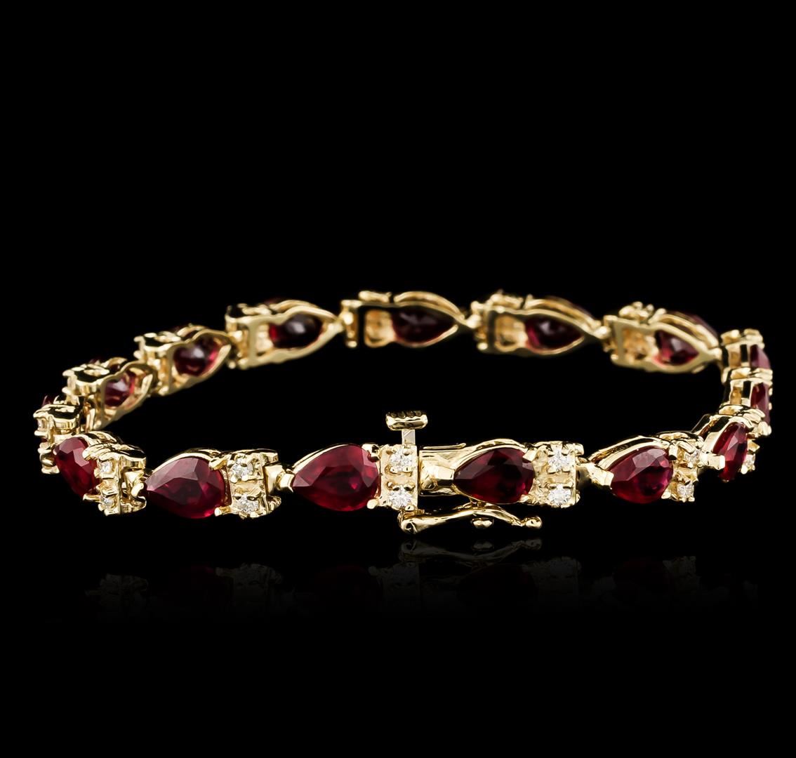 One electronically tested 14KT yellow gold ladies cast ruby and diamond bracelet with a hidden box clasp with safety closer with a bright polish finish. Measurements: 7" in length. Identified with markings of "14K". Condition is new. Containing: Fifteen prong set pear modified brilliant cut natural rubies, measuring 7.00. x 5.00. x 3.25mm, approximate total weight of 11.40ct., clarity is heavily included, type II, medium dark, very slightly brownish, strongly purplish red color, (GIA stpR 6/3), cut is good. Thirty prong set round brilliant cut diamonds, measuring 2.00. - 2.00. x 1.20mm (depth est.) approximate total weight of 30 Stones = 0.88ct. Clarity: SI-1 to SI-2. Color: J - K, Cut is Good. Colored gemstones are presumed to have been subjected to commonly used enhancement processes. All diamonds and colored gemstones are graded in the mounting, unless otherwise stated. Total Weight of Colored Stones 11.40ct. Total Weight of Diamonds 0.88ct. Total Weight of Bracelet 13.00 grams. GGL Appraised at $5,180.00.