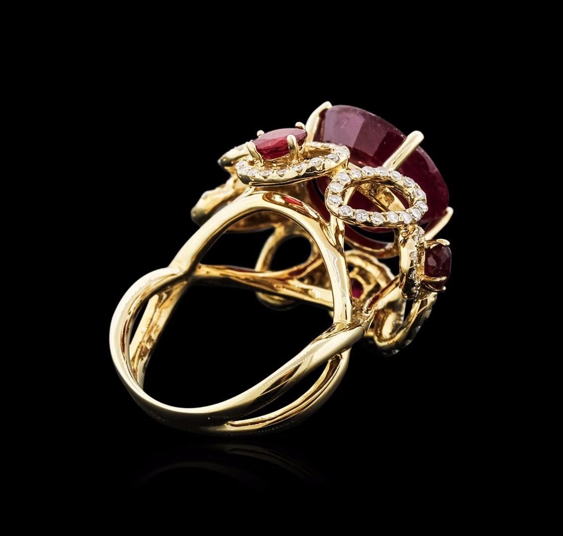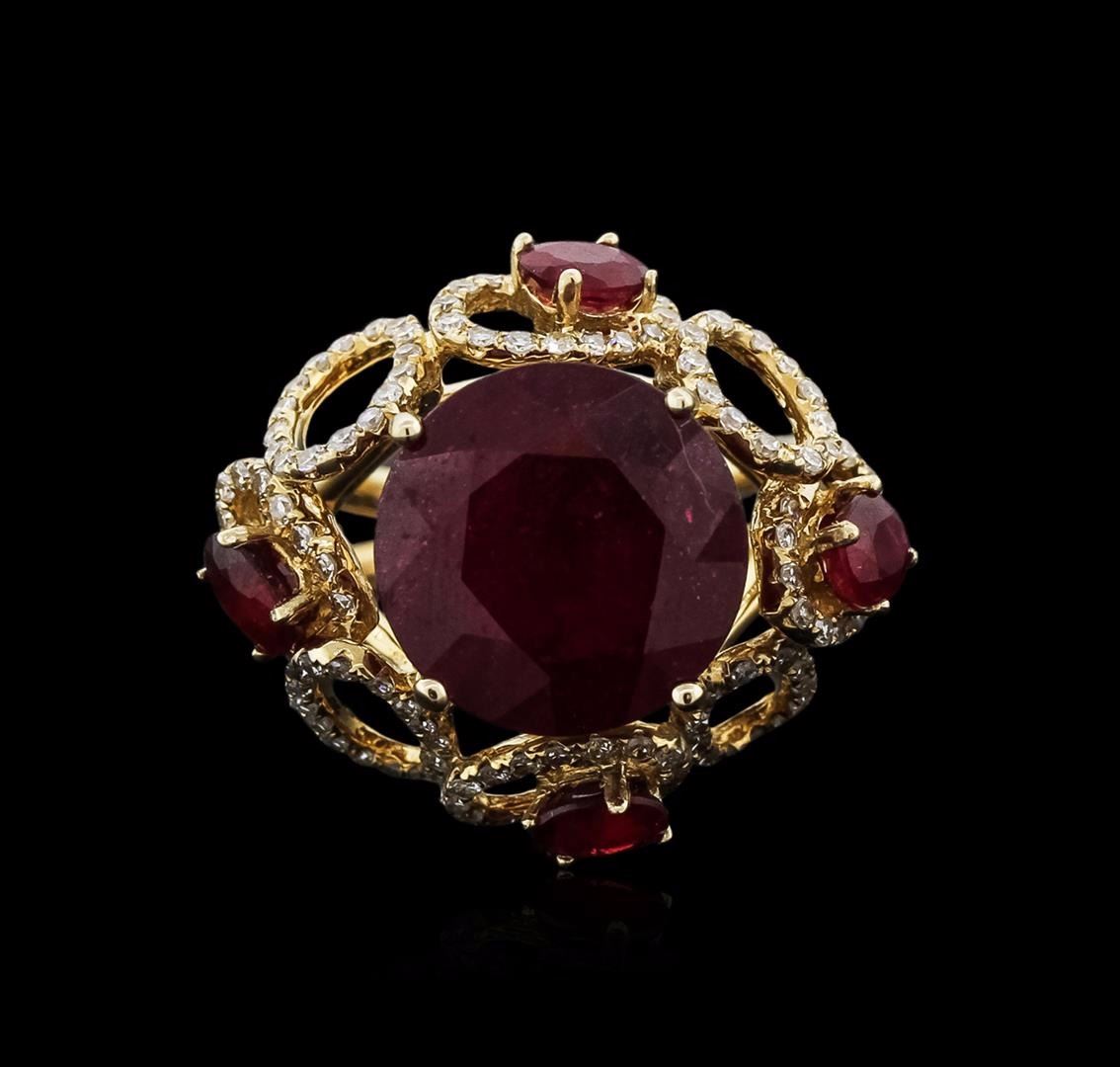One electronically tested 14KT yellow gold ladies cast ruby and diamond ring with a custom shank with a bright polish finish. Trademark is Orianne. Identified with markings of "14K". Condition is new. Containing: One prong set round modified brilliant cut natural ruby, measuring 12.89 - 12.89 x 7.51 mm, approximate weight of 9.98ct., clarity is heavily included, type II, medium dark, very slightly brownish, strongly purplish red color, (GIA stpR 6/3), cut is good. Four prong set oval modified brilliant cut natural rubies, measuring 4.77 x 3.77 x 2.45mm, approximate total weight of 1.48ct., clarity is moderately included, type II, medium dark, very slightly brownish, strongly purplish red color, (GIA stpR 6/3), cut is good. One Hundred Sixty-Seven prong set single cut diamonds, measuring 1.10 - 1.10 x 0.66mm (depth est.) approximate total weight of 167 Stones = 0.75ct. Clarity: SI-1. Color: J - K. All diamonds and colored gemstones are graded in the mounting, unless otherwise stated. Colored gemstones are presumed to have been subjected to commonly used enhancement processes. Total Weight of Colored Stones 11.46ct. Total Weight of Diamonds 0.75ct. Total Weight of Ring 9.80 grams. GGL Appraised at $4,720.00.