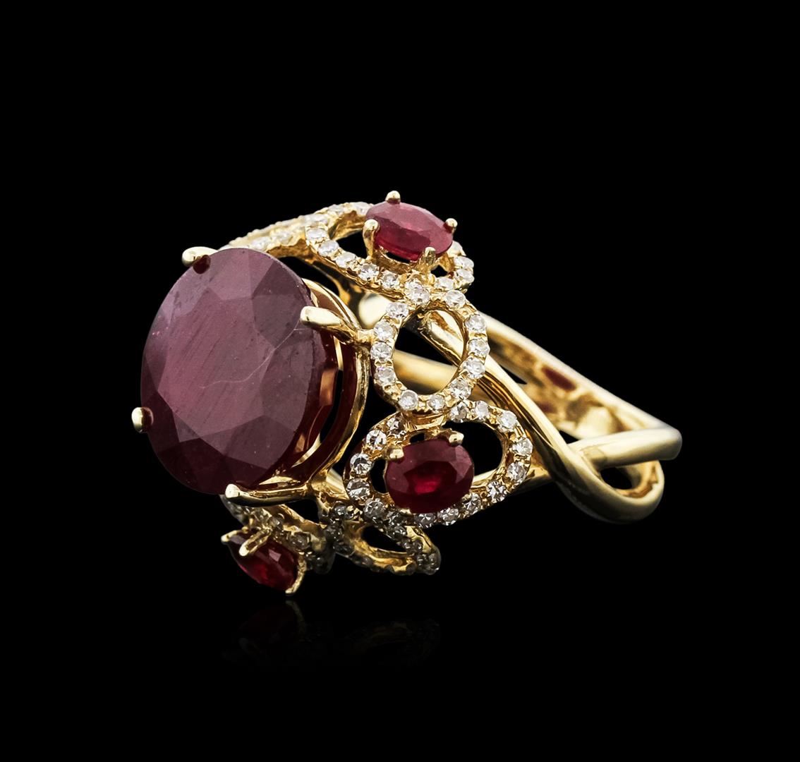 One electronically tested 14KT yellow gold ladies cast ruby and diamond ring with a custom shank with a bright polish finish. Trademark is Orianne. Identified with markings of "14K". Condition is new. Containing: One prong set round modified brilliant cut natural ruby, measuring 12.89 - 12.89 x 7.51 mm, approximate weight of 9.98ct., clarity is heavily included, type II, medium dark, very slightly brownish, strongly purplish red color, (GIA stpR 6/3), cut is good. Four prong set oval modified brilliant cut natural rubies, measuring 4.77 x 3.77 x 2.45mm, approximate total weight of 1.48ct., clarity is moderately included, type II, medium dark, very slightly brownish, strongly purplish red color, (GIA stpR 6/3), cut is good. One Hundred Sixty-Seven prong set single cut diamonds, measuring 1.10 - 1.10 x 0.66mm (depth est.) approximate total weight of 167 Stones = 0.75ct. Clarity: SI-1. Color: J - K. All diamonds and colored gemstones are graded in the mounting, unless otherwise stated. Colored gemstones are presumed to have been subjected to commonly used enhancement processes. Total Weight of Colored Stones 11.46ct. Total Weight of Diamonds 0.75ct. Total Weight of Ring 9.80 grams. GGL Appraised at $4,720.00.