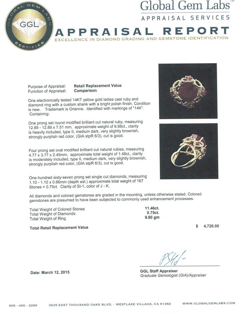 One electronically tested 14KT yellow gold ladies cast ruby and diamond ring with a custom shank with a bright polish finish. Trademark is Orianne. Identified with markings of "14K". Condition is new. Containing: One prong set round modified brilliant cut natural ruby, measuring 12.89 - 12.89 x 7.51 mm, approximate weight of 9.98ct., clarity is heavily included, type II, medium dark, very slightly brownish, strongly purplish red color, (GIA stpR 6/3), cut is good. Four prong set oval modified brilliant cut natural rubies, measuring 4.77 x 3.77 x 2.45mm, approximate total weight of 1.48ct., clarity is moderately included, type II, medium dark, very slightly brownish, strongly purplish red color, (GIA stpR 6/3), cut is good. One Hundred Sixty-Seven prong set single cut diamonds, measuring 1.10 - 1.10 x 0.66mm (depth est.) approximate total weight of 167 Stones = 0.75ct. Clarity: SI-1. Color: J - K. All diamonds and colored gemstones are graded in the mounting, unless otherwise stated. Colored gemstones are presumed to have been subjected to commonly used enhancement processes. Total Weight of Colored Stones 11.46ct. Total Weight of Diamonds 0.75ct. Total Weight of Ring 9.80 grams. GGL Appraised at $4,720.00.