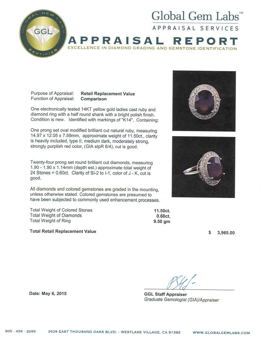 One electronically tested 14KT yellow gold ladies cast ruby and diamond ring with a half round shank with a bright polish finish. Identified with markings of "K14". Condition is new. Containing: One prong set oval modified brilliant cut natural ruby, measuring 14.97 x 12.05 x 7.59mm, approximate weight of 11.50ct., clarity is heavily included, type II, medium dark, moderately strong, strongly purplish red color, (GIA stpR 6/4), cut is good. Twenty-Four prong set round brilliant cut diamonds, measuring 1.90 - 1.90 x 1.14mm (depth est.) approximate total weight of 24 Stones = 0.60ct. Clarity: SI-2 to I-1. Color: J - K, Cut is Good. All diamonds and colored gemstones are graded in the mounting, unless otherwise stated. Colored gemstones are presumed to have been subjected to commonly used enhancement processes.. Total Weight of Colored Stones 11.50ct. Total Weight of Diamonds 0.60ct. Total Weight of Ring 9.50 grams. GGL Appraised at $3,965.00.