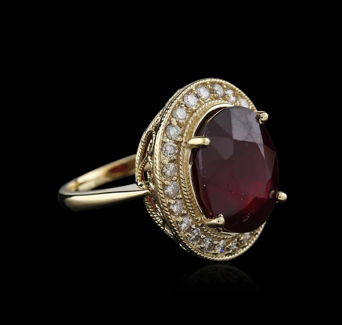 One electronically tested 14KT yellow gold ladies cast ruby and diamond ring with a half round shank with a bright polish finish. Identified with markings of "K14". Condition is new. Containing: One prong set oval modified brilliant cut natural ruby, measuring 14.97 x 12.05 x 7.59mm, approximate weight of 11.50ct., clarity is heavily included, type II, medium dark, moderately strong, strongly purplish red color, (GIA stpR 6/4), cut is good. Twenty-Four prong set round brilliant cut diamonds, measuring 1.90 - 1.90 x 1.14mm (depth est.) approximate total weight of 24 Stones = 0.60ct. Clarity: SI-2 to I-1. Color: J - K, Cut is Good. All diamonds and colored gemstones are graded in the mounting, unless otherwise stated. Colored gemstones are presumed to have been subjected to commonly used enhancement processes.. Total Weight of Colored Stones 11.50ct. Total Weight of Diamonds 0.60ct. Total Weight of Ring 9.50 grams. GGL Appraised at $3,965.00.