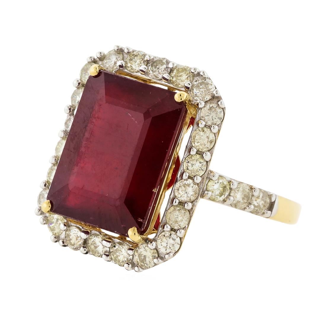 One electronically tested 14KT yellow gold ladies cast & assembled ruby and diamond ring. The featured ruby is set within a diamond bezel supported by a lattice under gallery and stylized diamond set split shoulders, completed by a two millimeter wide band. Bright polish finish with rhodium accents. Trademark is Orianne. Identified with markings of "14K". Condition is new, good workmanship. Containing: One prong set pear mixed cut natural ruby, measuring 15.50 x 11.10 x 7.00mm, approximate weight of 8.46ct., clarity is heavily included, type II, dark, very slightly brownish, slightly purplish red color, (GIA slpR 7/3), cut is good. Transmitting light somewhat diffusely, transparent to translucent. Naturally occurring internal & external characteristics are present. Indications of laboratory high temperature heat treatment, with glass & flux additives. Graded in the setting. Ruby has a low tolerance to rhodium plating, repolishing the surface, & ultrasonic cleaning. Eighty-Two prong set round brilliant cut diamonds approximate total weight of 82 Stones = 0.49ct. The group is composed of a mix of natural faint yellow and very light yellow diamonds. Graded in the setting. Clarity: I-1 to I-3. Total Weight of Colored Stones 8.46ct. Total Weight of Diamonds 0.49ct. Total Weight of Ring 7.19gm. AIG Appraised at $5,250.00.