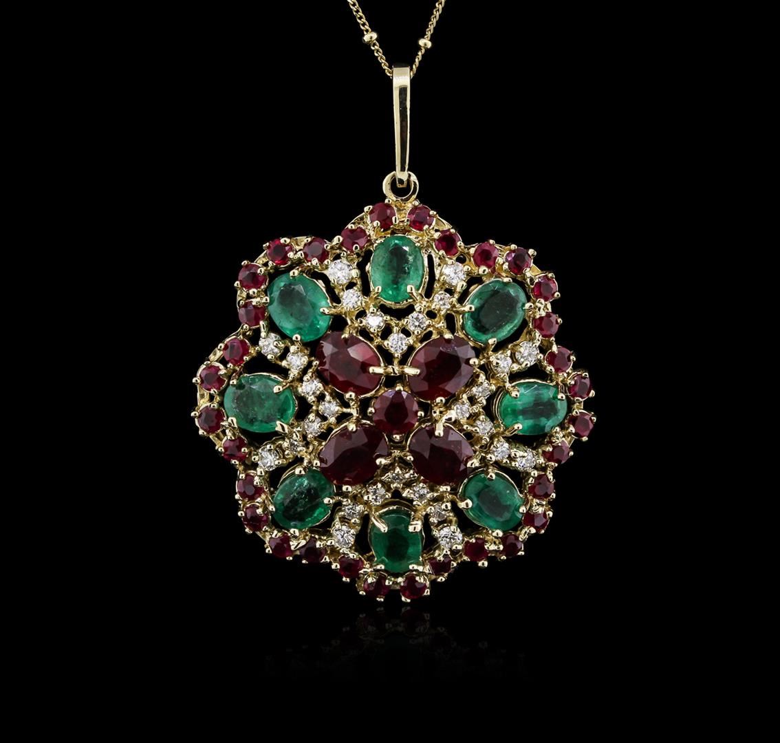 One electronically tested 14KT yellow gold ladies cast emerald, ruby and diamond pendant & chain 18.0" long, with a spring ring clasp with a bright polish finish. Identified with markings of "14KT". Condition is new. Containing: Eight oval modified brilliant cut natural emeralds, measuring 8.00 x 5.69 x 3.70mm, approximate total weight of 8.65ct., clarity is eye clean, type III, medium light, very slightly grayish, green color, (GIA G 4/3)Four prong set oval modified brilliant cut natural rubies, measuring 8.00 x 6.00 x 3.90mm, approximate total weight of 7.28ct., clarity is moderately included, medium, very slightly grayish, purple red color, (GIA PR 5/3), cut is good. One prong set round modified brilliant cut natural ruby, measuring 5.00 - 5.00 x 3.25 mm, approximate weight of 0.69ct., clarity is moderately included, medium, very slightly grayish, purple red color, (GIA PR 5/3), cut is good. Thirty-two prong set round modified brilliant cut natural rubies, measuring 2.00 - 2.00 x 1.30 mm, approximate total weight of 3.81ct., clarity is moderately included, medium, slightly grayish, purple red color, (GIA PR 5/2), cut is good. Twenty-Eight prong set round brilliant cut diamonds, measuring 2.50 - 2.00 x 1.35mm (depth est.) approximate total weight of 28 Stones = 1.21ct. Clarity: VS-2 to SI-1. Color: K - L, Cut is Good. Colored gemstones are presumed to have been subjected to commonly used enhancement processes. All diamonds and colored gemstones are graded in the mounting, unless otherwise stated. Total Weight of Colored Stones 20.43ct. Total Weight of Diamonds 1.21ct. Total Weight of Pendant & Chain 24.00 grams. GGL Appraised at $8,735.00.