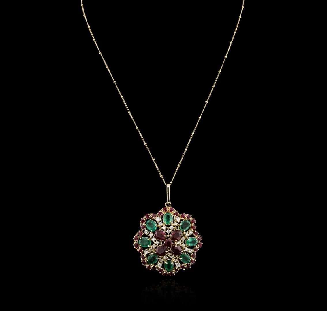 One electronically tested 14KT yellow gold ladies cast emerald, ruby and diamond pendant & chain 18.0" long, with a spring ring clasp with a bright polish finish. Identified with markings of "14KT". Condition is new. Containing: Eight oval modified brilliant cut natural emeralds, measuring 8.00 x 5.69 x 3.70mm, approximate total weight of 8.65ct., clarity is eye clean, type III, medium light, very slightly grayish, green color, (GIA G 4/3)Four prong set oval modified brilliant cut natural rubies, measuring 8.00 x 6.00 x 3.90mm, approximate total weight of 7.28ct., clarity is moderately included, medium, very slightly grayish, purple red color, (GIA PR 5/3), cut is good. One prong set round modified brilliant cut natural ruby, measuring 5.00 - 5.00 x 3.25 mm, approximate weight of 0.69ct., clarity is moderately included, medium, very slightly grayish, purple red color, (GIA PR 5/3), cut is good. Thirty-two prong set round modified brilliant cut natural rubies, measuring 2.00 - 2.00 x 1.30 mm, approximate total weight of 3.81ct., clarity is moderately included, medium, slightly grayish, purple red color, (GIA PR 5/2), cut is good. Twenty-Eight prong set round brilliant cut diamonds, measuring 2.50 - 2.00 x 1.35mm (depth est.) approximate total weight of 28 Stones = 1.21ct. Clarity: VS-2 to SI-1. Color: K - L, Cut is Good. Colored gemstones are presumed to have been subjected to commonly used enhancement processes. All diamonds and colored gemstones are graded in the mounting, unless otherwise stated. Total Weight of Colored Stones 20.43ct. Total Weight of Diamonds 1.21ct. Total Weight of Pendant & Chain 24.00 grams. GGL Appraised at $8,735.00.