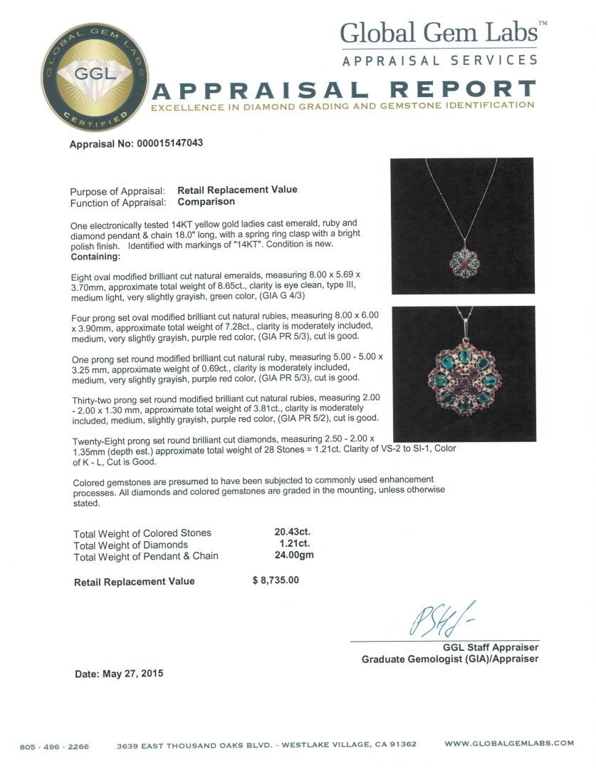 One electronically tested 14KT yellow gold ladies cast emerald, ruby and diamond pendant & chain 18.0" long, with a spring ring clasp with a bright polish finish. Identified with markings of "14KT". Condition is new. Containing: Eight oval modified brilliant cut natural emeralds, measuring 8.00 x 5.69 x 3.70mm, approximate total weight of 8.65ct., clarity is eye clean, type III, medium light, very slightly grayish, green color, (GIA G 4/3)Four prong set oval modified brilliant cut natural rubies, measuring 8.00 x 6.00 x 3.90mm, approximate total weight of 7.28ct., clarity is moderately included, medium, very slightly grayish, purple red color, (GIA PR 5/3), cut is good. One prong set round modified brilliant cut natural ruby, measuring 5.00 - 5.00 x 3.25 mm, approximate weight of 0.69ct., clarity is moderately included, medium, very slightly grayish, purple red color, (GIA PR 5/3), cut is good. Thirty-two prong set round modified brilliant cut natural rubies, measuring 2.00 - 2.00 x 1.30 mm, approximate total weight of 3.81ct., clarity is moderately included, medium, slightly grayish, purple red color, (GIA PR 5/2), cut is good. Twenty-Eight prong set round brilliant cut diamonds, measuring 2.50 - 2.00 x 1.35mm (depth est.) approximate total weight of 28 Stones = 1.21ct. Clarity: VS-2 to SI-1. Color: K - L, Cut is Good. Colored gemstones are presumed to have been subjected to commonly used enhancement processes. All diamonds and colored gemstones are graded in the mounting, unless otherwise stated. Total Weight of Colored Stones 20.43ct. Total Weight of Diamonds 1.21ct. Total Weight of Pendant & Chain 24.00 grams. GGL Appraised at $8,735.00.