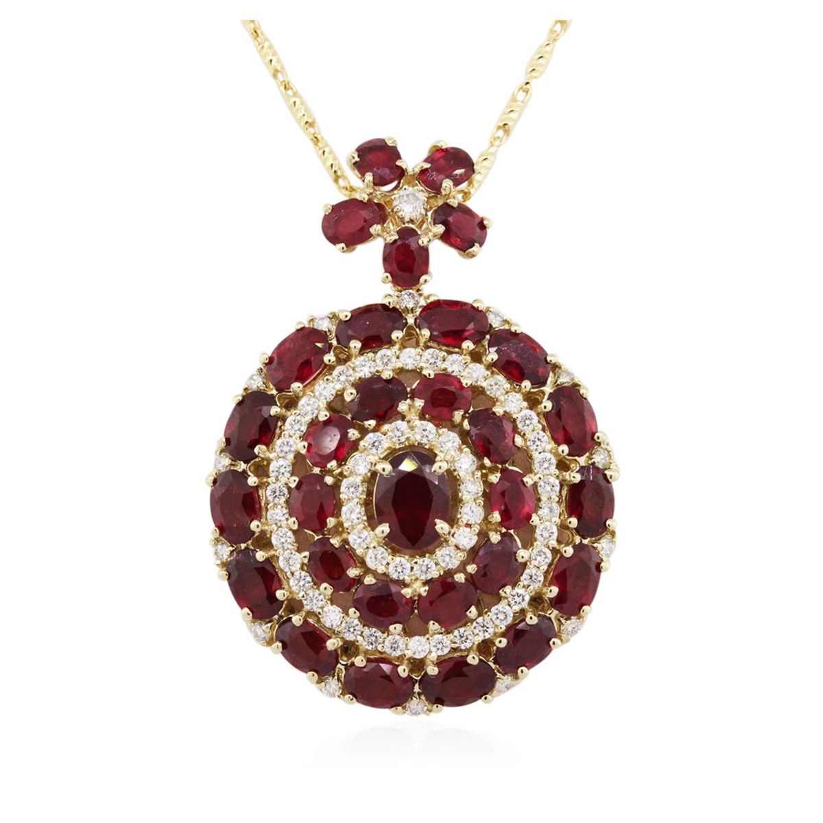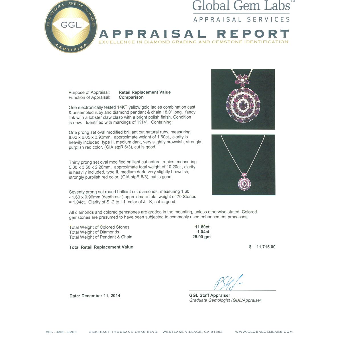 One electronically tested 14KT yellow gold ladies combination cast & assembled ruby and diamond pendant & chain 18.0" long, fancy link with a lobster claw clasp with a bright polish finish. Identified with markings of "K14". Condition is new. Containing: One prong set oval modified brilliant cut natural ruby, measuring 8.02 x 6.05 x 3.93mm, approximate weight of 1.60ct., clarity is heavily included, type II, medium dark, very slightly brownish, strongly purplish red color, (GIA stpR 6/3), cut is good. Thirty prong set oval modified brilliant cut natural rubies, measuring 5.00 x 3.50 x 2.28mm, approximate total weight of 10.20ct., clarity is heavily included, type II, medium dark, very slightly brownish, strongly purplish red color, (GIA stpR 6/3), cut is good. Seventy prong set round brilliant cut diamonds, measuring 1.60 - 1.60 x 0.96mm (depth est.) approximate total weight of 70 Stones = 1.04ct. Clarity: SI-2 to I-1. Color: J - K, Cut is Good. All diamonds and colored gemstones are graded in the mounting, unless otherwise stated. Colored gemstones are presumed to have been subjected to commonly used enhancement processes. Total Weight of Colored Stones 11.80ct. Total Weight of Diamonds 1.04ct. Total Weight of Pendant & Chain 25.90 grams. GGL Appraised at $11,715.00.