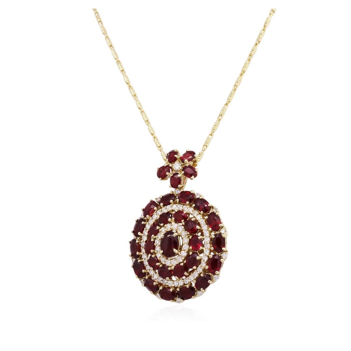 One electronically tested 14KT yellow gold ladies combination cast & assembled ruby and diamond pendant & chain 18.0" long, fancy link with a lobster claw clasp with a bright polish finish. Identified with markings of "K14". Condition is new. Containing: One prong set oval modified brilliant cut natural ruby, measuring 8.02 x 6.05 x 3.93mm, approximate weight of 1.60ct., clarity is heavily included, type II, medium dark, very slightly brownish, strongly purplish red color, (GIA stpR 6/3), cut is good. Thirty prong set oval modified brilliant cut natural rubies, measuring 5.00 x 3.50 x 2.28mm, approximate total weight of 10.20ct., clarity is heavily included, type II, medium dark, very slightly brownish, strongly purplish red color, (GIA stpR 6/3), cut is good. Seventy prong set round brilliant cut diamonds, measuring 1.60 - 1.60 x 0.96mm (depth est.) approximate total weight of 70 Stones = 1.04ct. Clarity: SI-2 to I-1. Color: J - K, Cut is Good. All diamonds and colored gemstones are graded in the mounting, unless otherwise stated. Colored gemstones are presumed to have been subjected to commonly used enhancement processes. Total Weight of Colored Stones 11.80ct. Total Weight of Diamonds 1.04ct. Total Weight of Pendant & Chain 25.90 grams. GGL Appraised at $11,715.00.