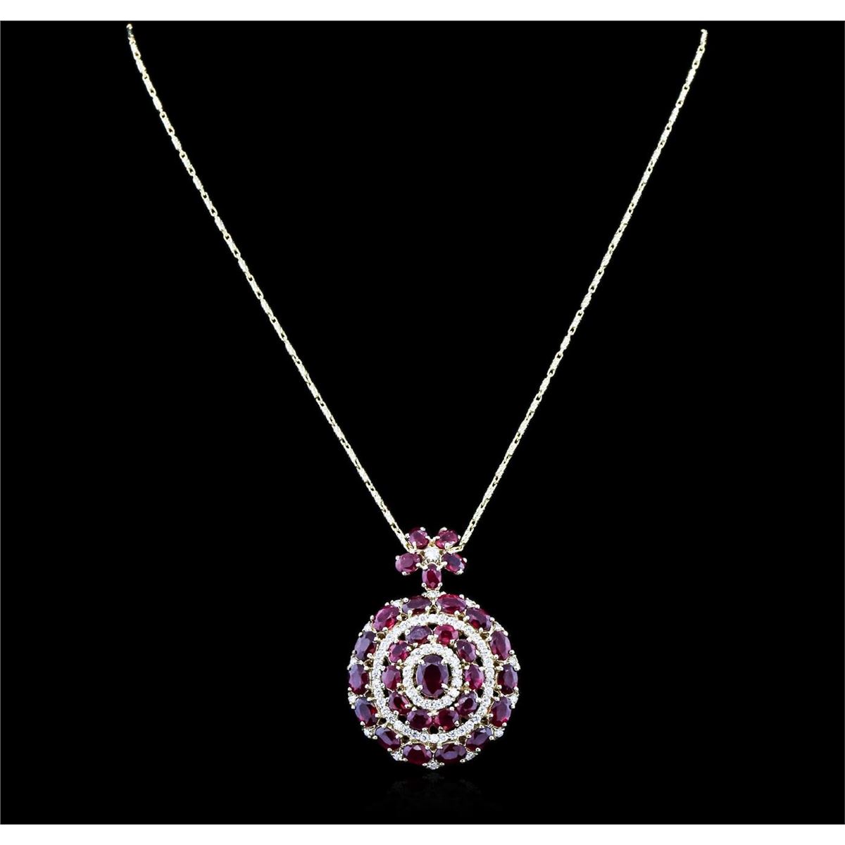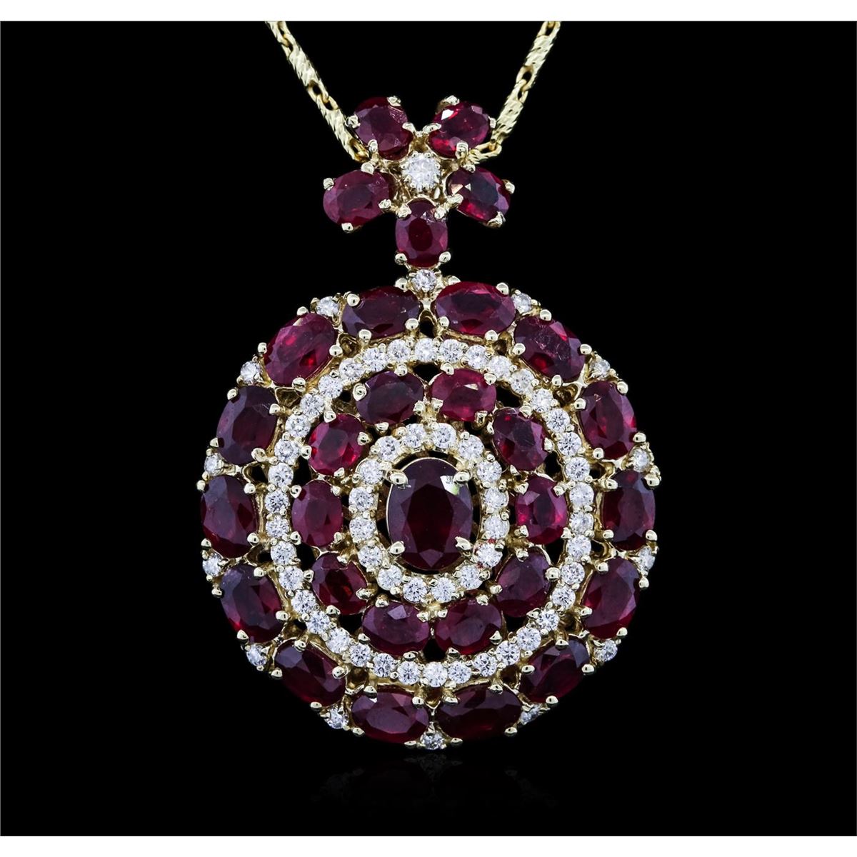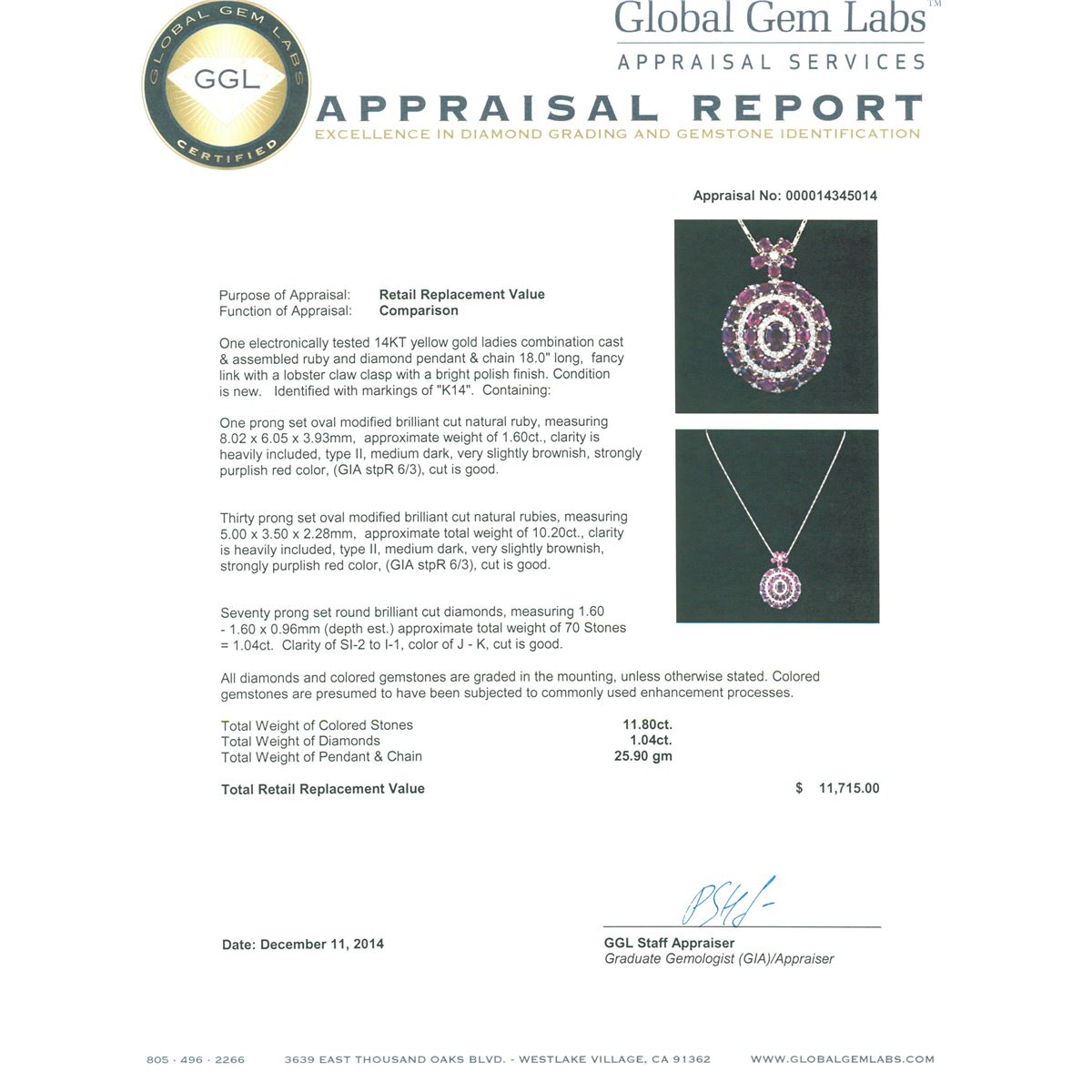 One electronically tested 14KT yellow gold ladies combination cast & assembled ruby and diamond pendant & chain 18.0" long, fancy link with a lobster claw clasp with a bright polish finish. Identified with markings of "K14". Condition is new. Containing: One prong set oval modified brilliant cut natural ruby, measuring 8.02 x 6.05 x 3.93mm, approximate weight of 1.60ct., clarity is heavily included, type II, medium dark, very slightly brownish, strongly purplish red color, (GIA stpR 6/3), cut is good. Thirty prong set oval modified brilliant cut natural rubies, measuring 5.00 x 3.50 x 2.28mm, approximate total weight of 10.20ct., clarity is heavily included, type II, medium dark, very slightly brownish, strongly purplish red color, (GIA stpR 6/3), cut is good. Seventy prong set round brilliant cut diamonds, measuring 1.60 - 1.60 x 0.96mm (depth est.) approximate total weight of 70 Stones = 1.04ct. Clarity: SI-2 to I-1. Color: J - K, Cut is Good. All diamonds and colored gemstones are graded in the mounting, unless otherwise stated. Colored gemstones are presumed to have been subjected to commonly used enhancement processes. Total Weight of Colored Stones 11.80ct. Total Weight of Diamonds 1.04ct. Total Weight of Pendant & Chain 25.90 grams. GGL Appraised at $11,715.00.