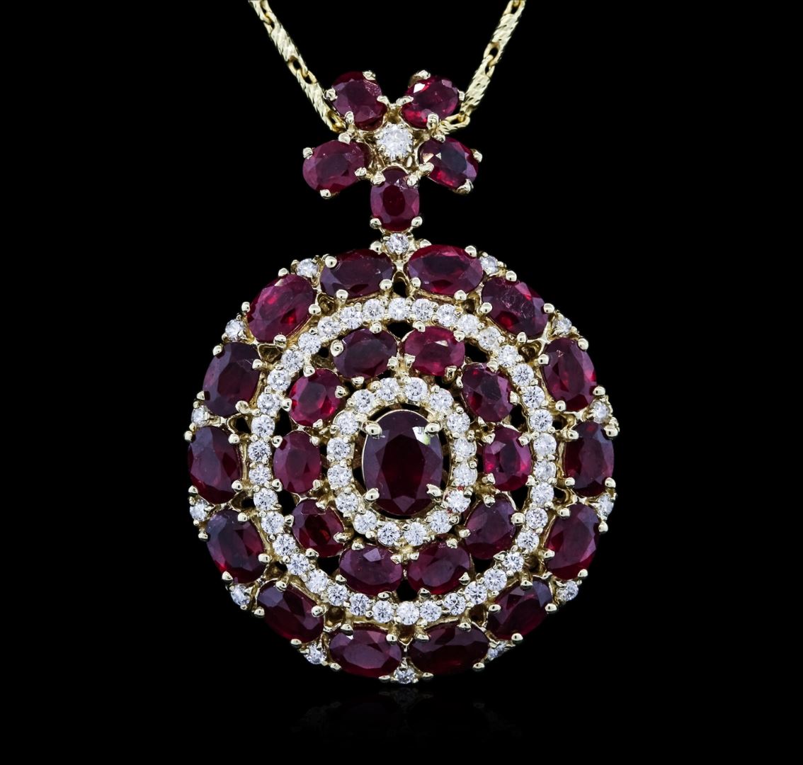 One electronically tested 14KT yellow gold ladies combination cast & assembled ruby and diamond pendant & chain 18.0" long, fancy link with a lobster claw clasp with a bright polish finish. Identified with markings of "K14". Condition is new. Containing: One prong set oval modified brilliant cut natural ruby, measuring 8.02 x 6.05 x 3.93mm, approximate weight of 1.60ct., clarity is heavily included, type II, medium dark, very slightly brownish, strongly purplish red color, (GIA stpR 6/3), cut is good. Thirty prong set oval modified brilliant cut natural rubies, measuring 5.00 x 3.50 x 2.28mm, approximate total weight of 10.20ct., clarity is heavily included, type II, medium dark, very slightly brownish, strongly purplish red color, (GIA stpR 6/3), cut is good. Seventy prong set round brilliant cut diamonds, measuring 1.60 - 1.60 x 0.96mm (depth est.) approximate total weight of 70 Stones = 1.04ct. Clarity: SI-2 to I-1. Color: J - K, Cut is Good. All diamonds and colored gemstones are graded in the mounting, unless otherwise stated. Colored gemstones are presumed to have been subjected to commonly used enhancement processes. Total Weight of Colored Stones 11.80ct. Total Weight of Diamonds 1.04ct. Total Weight of Pendant & Chain 25.90 grams. GGL Appraised at $11,715.00.