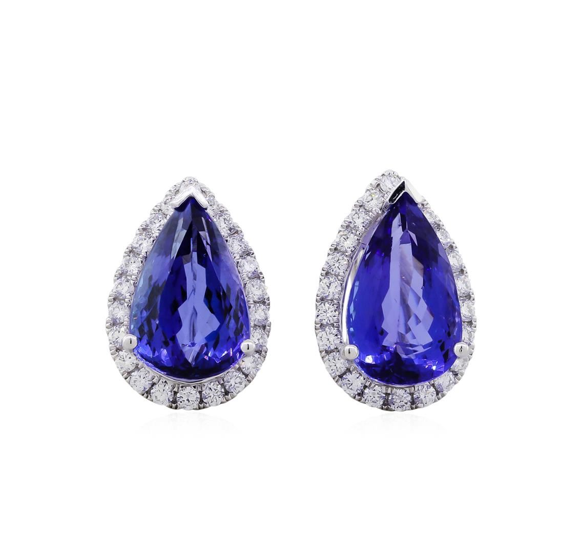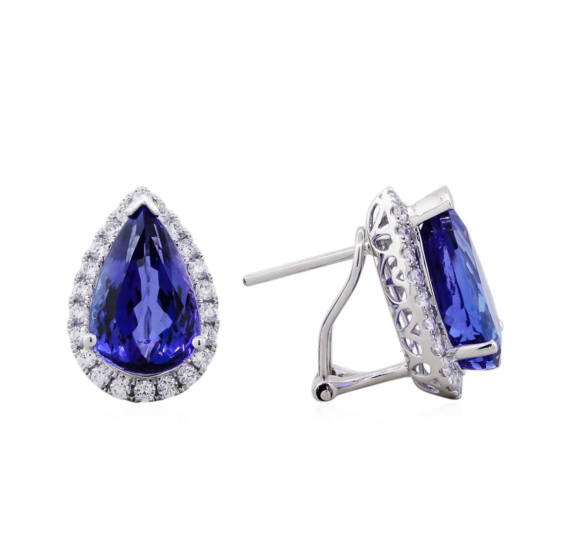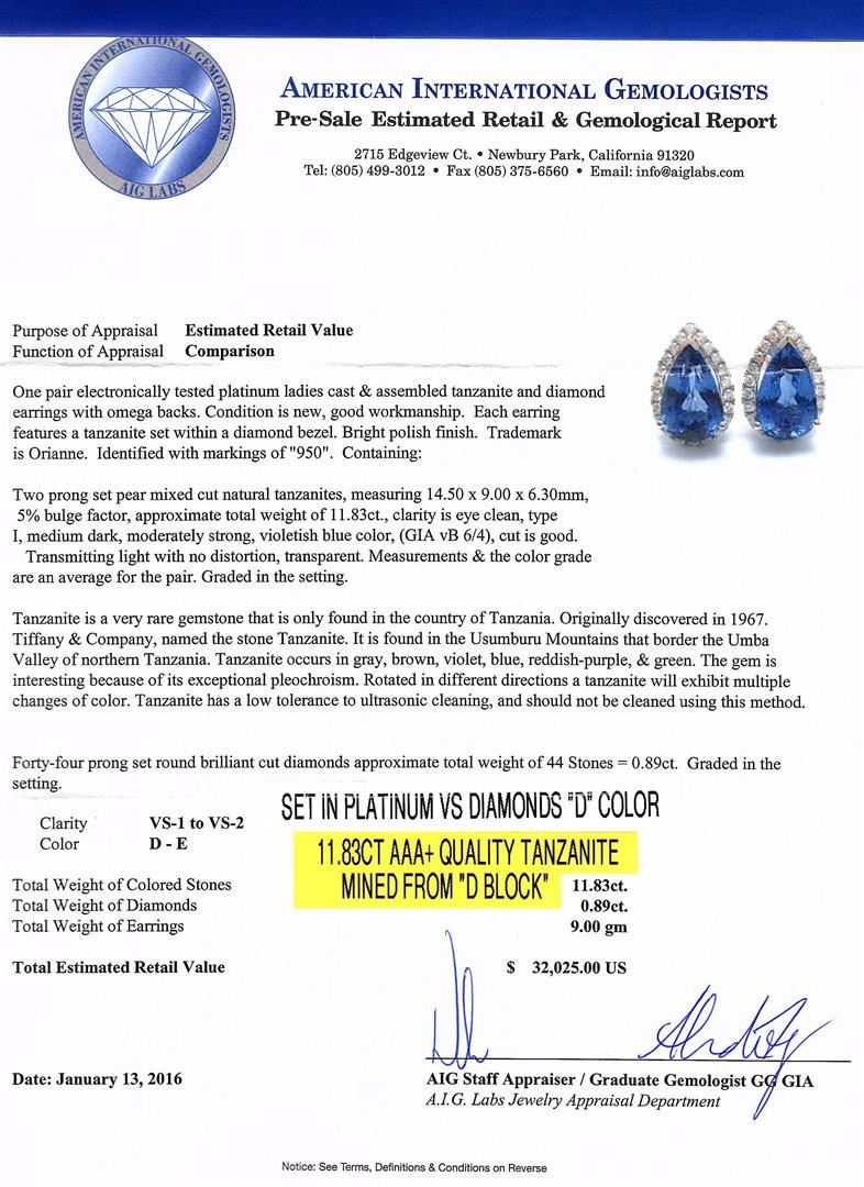One pair electronically tested platinum ladies cast & assembled tanzanite and diamond earrings with omega backs. Each earring features a tanzanite set within a diamond bezel. Bright polish finish. Trademark is Orianne. Identified with markings of "950". Condition is new, good workmanship. Containing: Two prong set pear mixed cut natural tanzanites, measuring 14.50 x 9.00 x 6.30mm, 5%. bulge factor, approximate. Total Weight of 11.83ct., clarity is eye clean, type I, medium dark, moderately strong, violetish blue color, (GIA vB 6/4), cut is good. Transmitting light with no distortion, transparent. Measurements & the color grade are an average for the pair. Graded in the setting.Tanzanite is a very rare gemstone that is only found in the country of Tanzania. Originally discovered in 1967. Tiffany & Company, named the stone Tanzanite. It is found in the Usumburu Mountains that border the Umba Valley of northern Tanzania. Tanzanite occurs in gray, brown, violet, blue, reddish-purple, & green. The gem is interesting because of its exceptional pleochroism. Rotated in different directions a tanzanite will exhibit multiple changes of color. Tanzanite has a low tolerance to ultrasonic cleaning, and should not be cleaned using this method.Forty-Four prong set round brilliant cut diamonds approximate. Total Weight of 44 Stones = 0.89ct. Graded in the setting. Clarity: VS-1 to VS-2. Color: D - E. Total Weight of Colored Stones 11.83ct. Total Weight of Diamonds 0.89ct. Total Weight of Earrings 9.00gm. AIG Appraised at $32,025.00.