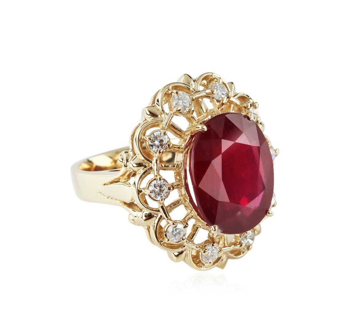 One electronically tested 14KT yellow gold lady's cast fashion ring with a bright polish finish. The featured lady's ring has a shank measuring 3.94 millimeters in width. Identified with markings of "K14". Condition is new, good workmanship. Containing: One prong set oval modified brilliant cut natural ruby, measuring 15.14 x 12.67 x 6.70mm, 10%. bulge factor, approximate weight of 12.00ct., clarity is heavily included, type II, medium dark, moderately strong, red color, (GIA R 6/4), cut is very good. Indications of laboratory high temperature heat treatment, with glass & flux additives. Colored gemstones are presumed to have been subjected to commonly used enhancement processes. Graded in the setting. Ten prong set round brilliant cut diamonds, measuring 2.60 - 2.50 x 1.53mm (depth est.) approximate total weight of 10 Stones = 0.61ct. Graded in the setting. Clarity: SI-1 to SI-2 . Color: G - Good. Total Weight of Colored Stones 12.00ct. Total Weight of Diamonds 0.61ct. Total Weight of Ring 11.10 grams. GAS Appraised at $7,800.00.