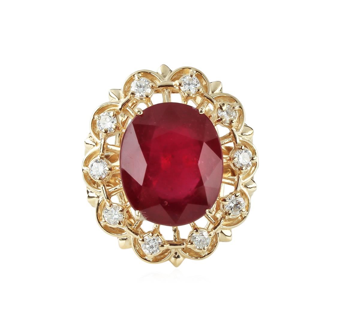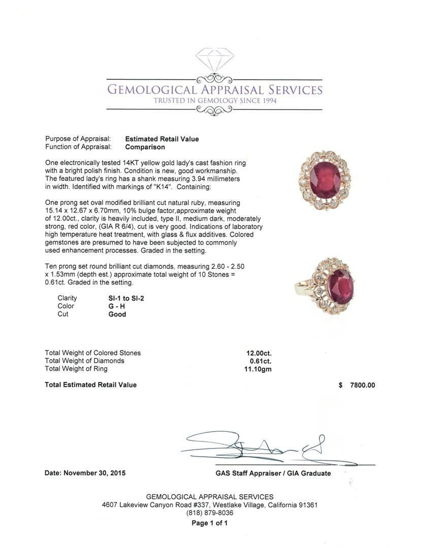 One electronically tested 14KT yellow gold lady's cast fashion ring with a bright polish finish. The featured lady's ring has a shank measuring 3.94 millimeters in width. Identified with markings of "K14". Condition is new, good workmanship. Containing: One prong set oval modified brilliant cut natural ruby, measuring 15.14 x 12.67 x 6.70mm, 10%. bulge factor, approximate weight of 12.00ct., clarity is heavily included, type II, medium dark, moderately strong, red color, (GIA R 6/4), cut is very good. Indications of laboratory high temperature heat treatment, with glass & flux additives. Colored gemstones are presumed to have been subjected to commonly used enhancement processes. Graded in the setting. Ten prong set round brilliant cut diamonds, measuring 2.60 - 2.50 x 1.53mm (depth est.) approximate total weight of 10 Stones = 0.61ct. Graded in the setting. Clarity: SI-1 to SI-2 . Color: G - Good. Total Weight of Colored Stones 12.00ct. Total Weight of Diamonds 0.61ct. Total Weight of Ring 11.10 grams. GAS Appraised at $7,800.00.