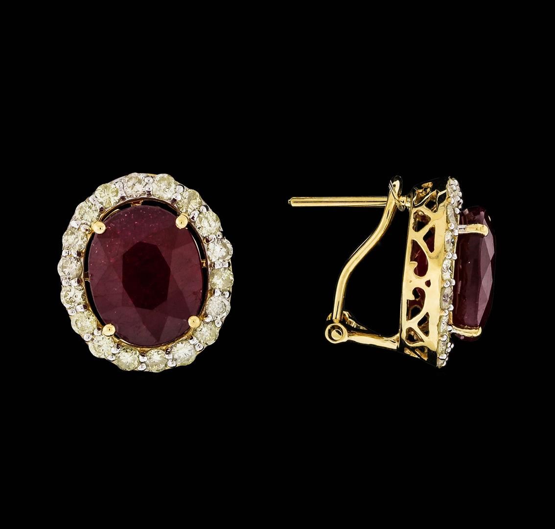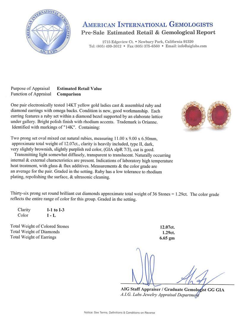 One pair electronically tested 14KT yellow gold ladies cast & assembled ruby and diamond earrings with omega backs. Each earring features a ruby set within a diamond bezel supported by an elaborate lattice under gallery. Bright polish finish with rhodium accents. Trademark is Orianne. Identified with markings of "14K". Condition is new, good workmanship. Containing: Two prong set oval mixed cut natural rubies, measuring 11.00 x 9.00 x 6.50mm, approximate total weight of 12.07ct., clarity is heavily included, type II, dark, very slightly brownish, slightly purplish red color, (GIA slpR 7/3), cut is good. Transmitting light somewhat diffusely, transparent to translucent. Naturally occurring internal & external characteristics are present. Indications of laboratory high temperature heat treatment, with glass & flux additives. Measurements & the color grade are an average for the pair. Graded in the setting. Ruby has a low tolerance to rhodium plating, repolishing the surface, & ultrasonic cleaning. Thirty-Six prong set round brilliant cut diamonds approximate total weight of 36 Stones = 1.29ct. The color grade reflects the entire range of color for this group. Graded in the setting. Clarity: I-1 to I-3. Color: I - L. Total Weight of Colored Stones 12.07ct. Total Weight of Diamonds 1.29ct. Total Weight of Earrings 6.65gm. AIG Appraised.