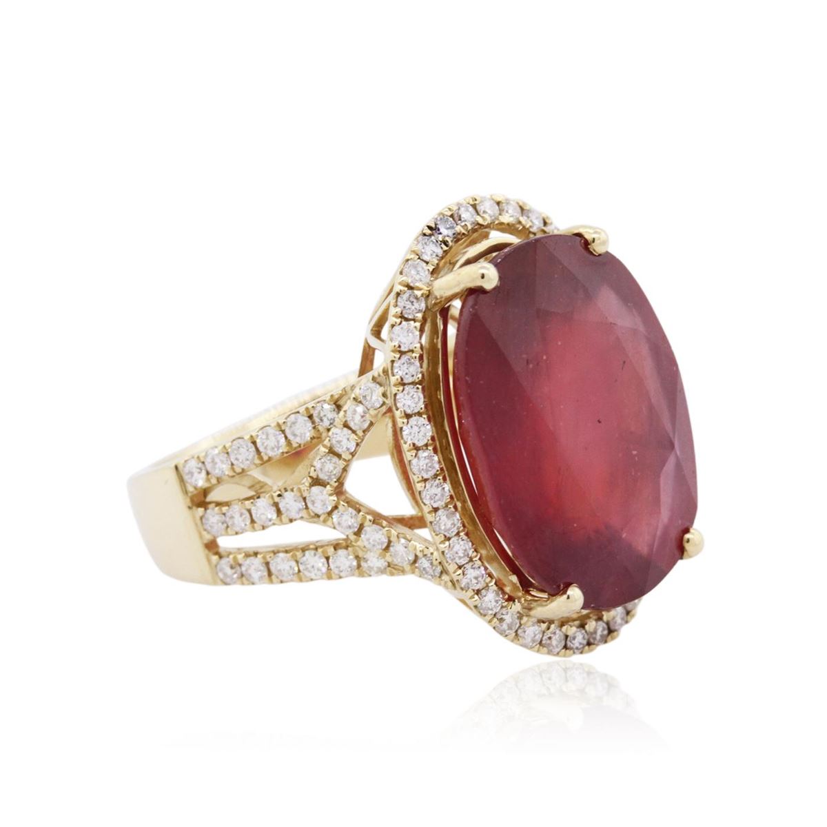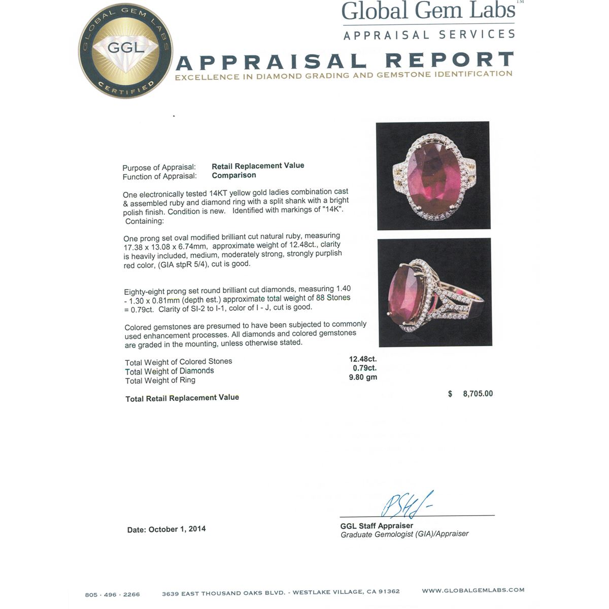 One electronically tested 14KT yellow gold ladies combination cast & assembled ruby and diamond ring with a split shank with a bright polish finish. Identified with markings of "14K". Condition is new. Containing: One prong set oval modified brilliant cut natural ruby, measuring 17.38 x 13.08 x 6.74mm, approximate weight of 12.48ct., clarity is heavily included, medium, moderately strong, strongly purplish red color, (GIA stpR 5/4), cut is good. Eighty-Eight prong set round brilliant cut diamonds, measuring 1.40 - 1.30 x 0.81mm (depth est.) approximate total weight of 88 Stones = 0.79ct. Clarity: SI-2 to I-1. Color: I - J, Cut is Good. Colored gemstones are presumed to have been subjected to commonly used enhancement processes. All diamonds and colored gemstones are graded in the mounting, unless otherwise stated. Total Weight of Colored Stones 12.48ct. Total Weight of Diamonds 0.79ct. Total Weight of Ring 9.80 grams. GGL Appraised at $8,705.00.