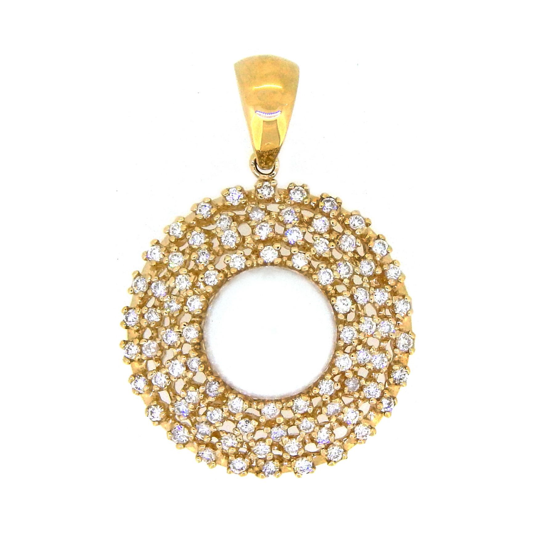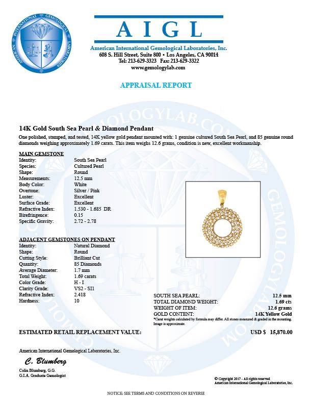 One 14KT Yellow Gold 12.5mm Pearl and Diamond Pendant. (1) South Sea Pearl measuring 12.5mm. (85) Diamonds with a total weight of 1.69cts with a color of H-I and clarity of VS-2 to SI-1. Total weight of this pendant is 12.6 grams.