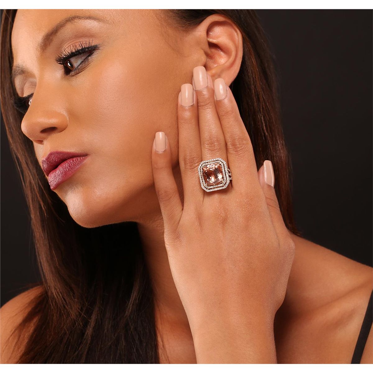 One electronically tested 14KT yellow gold Ladies combination cast & assembled ring with a bright polish finish. Condition is new. Identified with markings of "14K". Containing: One Hundred Forty-Two prong set round brilliant cut diamonds, measuring 1.50 - 1.50 x 0.90mm (depth est.) approximate. Total Weight of 142 Stones = 2.06ct. Clarity: I-1 to I-2. Color: J - K, Cut is Good. One prong set square cushion modified mixed cut natural morganite, measuring 14.20 x 14.10 x 9.35mm, exact weight 12.60ct., clarity is eye clean, type I, light, brownish, reddish orange color, (GIA rO 3/1), cut is very good. Colored gemstones are presumed to have been subjected to commonly used and possible undetectable color/clarity enhancement processes. Total Weight of Colored Stones 12.60ct. Total Weight of Diamonds 2.06ct. Total Weight of Ring 11.30 grams. GGL Appraised at $13,060.00.