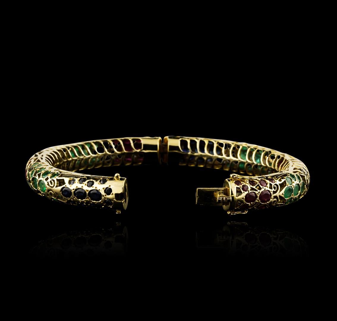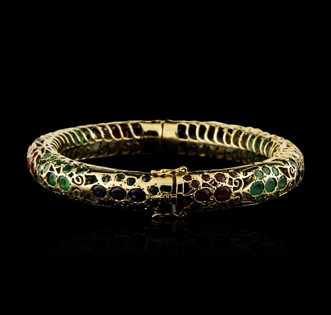One electronically tested 14KT yellow gold ladies cast emerald, ruby and sapphire bangle bracelet with a hidden box clasp with a bright polish finish. Measurements: 2.5" in diameter Condition is very good. Containing: Forty-five prong set oval modified brilliant cut natural emeralds, measuring 6.00 x 4.00 x 2.60mm, approximate total weight of 16.20ct., clarity is heavily included, type III, medium light, moderately strong, green color, (GIA G 4/4), cut is good. Forty-two prong set oval modified brilliant cut natural rubies, measuring 6.00 x 4.00 x 2.60mm, approximate total weight of 22.26ct., clarity is heavily included, medium, moderately strong, purple red color, (GIA PR 5/4), cut is good. One prong set oval modified brilliant cut natural blue sapphire, measuring 6.00 x 4.00 x 2.60mm, approximate weight of 0.52ct., clarity is slightly included, type II, medium, moderately strong, blue color, (GIA B 5/4), cut is good. Colored gemstones are presumed to have been subjected to commonly used enhancement processes. All colored gemstones are graded in the mounting, unless otherwise stated. Total Weight of Colored Stones 38.98ct. Total Weight of Bangle Bracelet 28.20 grams. GGL Appraised at $7,245.00.