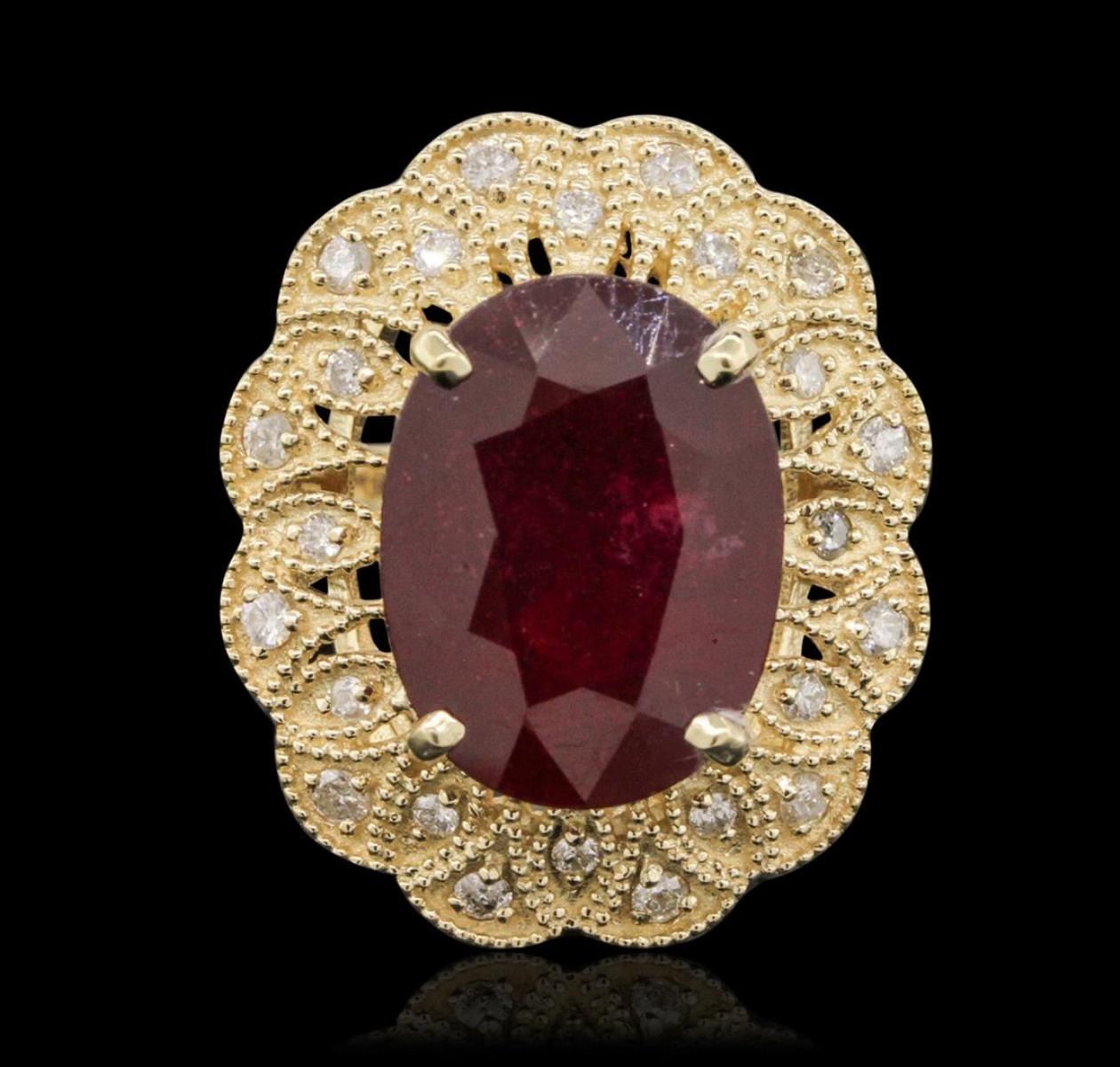 One electronically tested 14KT yellow gold ladies cast ruby and diamond ring. Condition is new, good workmanship. The featured ruby is set within a diamond accented lattice gallery, completed by a two and one-half millimeter wide band. Bright polish finish with milgrain detailing. Identified with markings of "K14". Containing: One prong set oval mixed cut natural ruby, measuring 16.00 x 12.50 x 7.20mm, 8%. bulge factor, approximate weight of 12.63ct., clarity is heavily included, type II, dark, very slightly brownish, slightly purplish red color, (GIA slpR 7/3), cut is good. Transmitting light somewhat diffusely, transparent to translucent. Naturally occurring internal & external characteristics are present. Indications of laboratory high temperature heat treatment, with glass & flux additives. Graded in the setting. Ruby has a low tolerance to rhodium plating, repolishing the surface, & ultrasonic cleaning. Twenty-Four prong set round brilliant cut diamonds, measuring 1.70 - 1.50 x 0.96mm (depth est.) approximate. Total Weight of 24 Stones = 0.45ct. Graded in the setting. Clarity: I-1 to I-2. Color: G - I. Total Weight of Colored Stones 12.63ct. Total Weight of Diamonds 0.45ct. Total Weight of Ring 12.81gm. AIG Appraised.