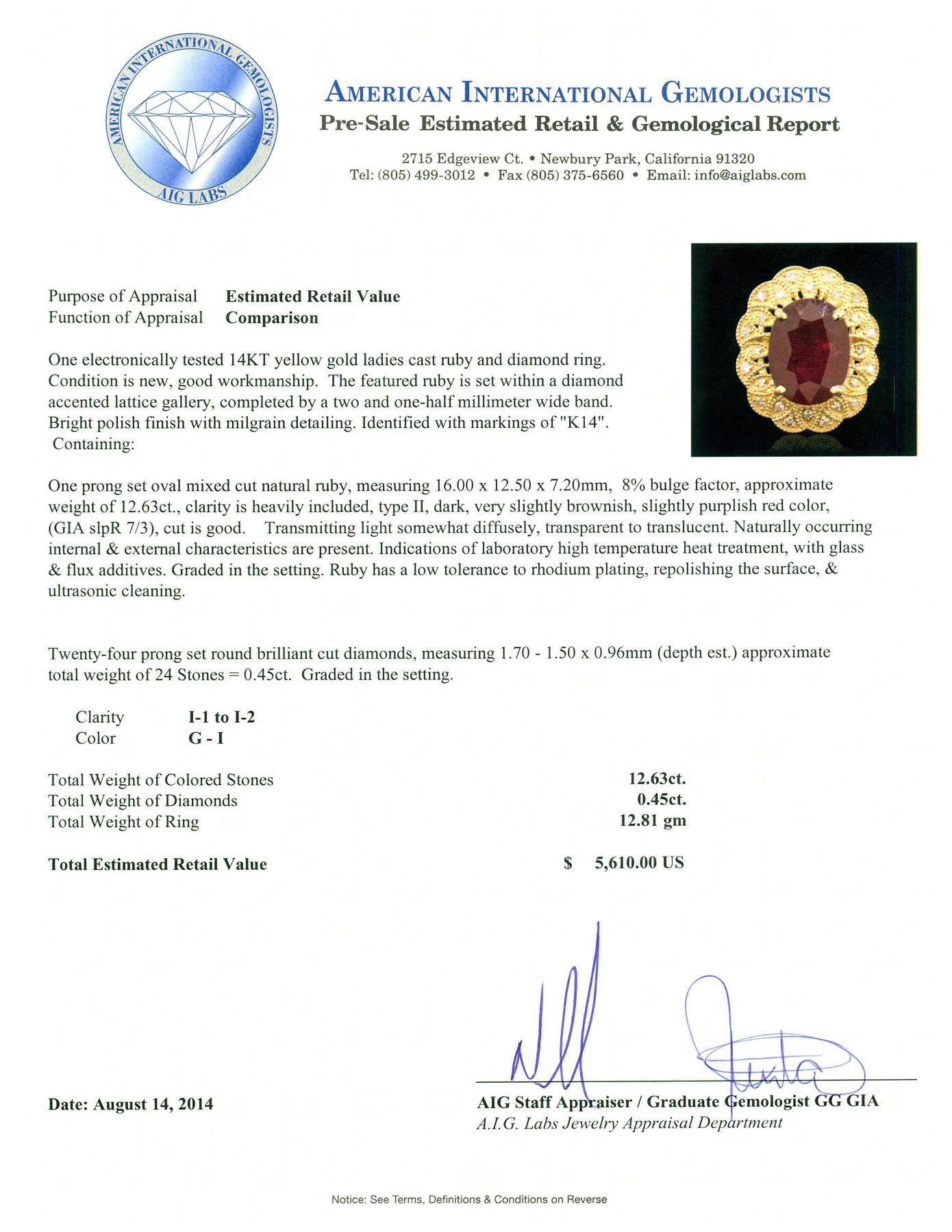 One electronically tested 14KT yellow gold ladies cast ruby and diamond ring. Condition is new, good workmanship. The featured ruby is set within a diamond accented lattice gallery, completed by a two and one-half millimeter wide band. Bright polish finish with milgrain detailing. Identified with markings of "K14". Containing: One prong set oval mixed cut natural ruby, measuring 16.00 x 12.50 x 7.20mm, 8%. bulge factor, approximate weight of 12.63ct., clarity is heavily included, type II, dark, very slightly brownish, slightly purplish red color, (GIA slpR 7/3), cut is good. Transmitting light somewhat diffusely, transparent to translucent. Naturally occurring internal & external characteristics are present. Indications of laboratory high temperature heat treatment, with glass & flux additives. Graded in the setting. Ruby has a low tolerance to rhodium plating, repolishing the surface, & ultrasonic cleaning. Twenty-Four prong set round brilliant cut diamonds, measuring 1.70 - 1.50 x 0.96mm (depth est.) approximate. Total Weight of 24 Stones = 0.45ct. Graded in the setting. Clarity: I-1 to I-2. Color: G - I. Total Weight of Colored Stones 12.63ct. Total Weight of Diamonds 0.45ct. Total Weight of Ring 12.81gm. AIG Appraised.