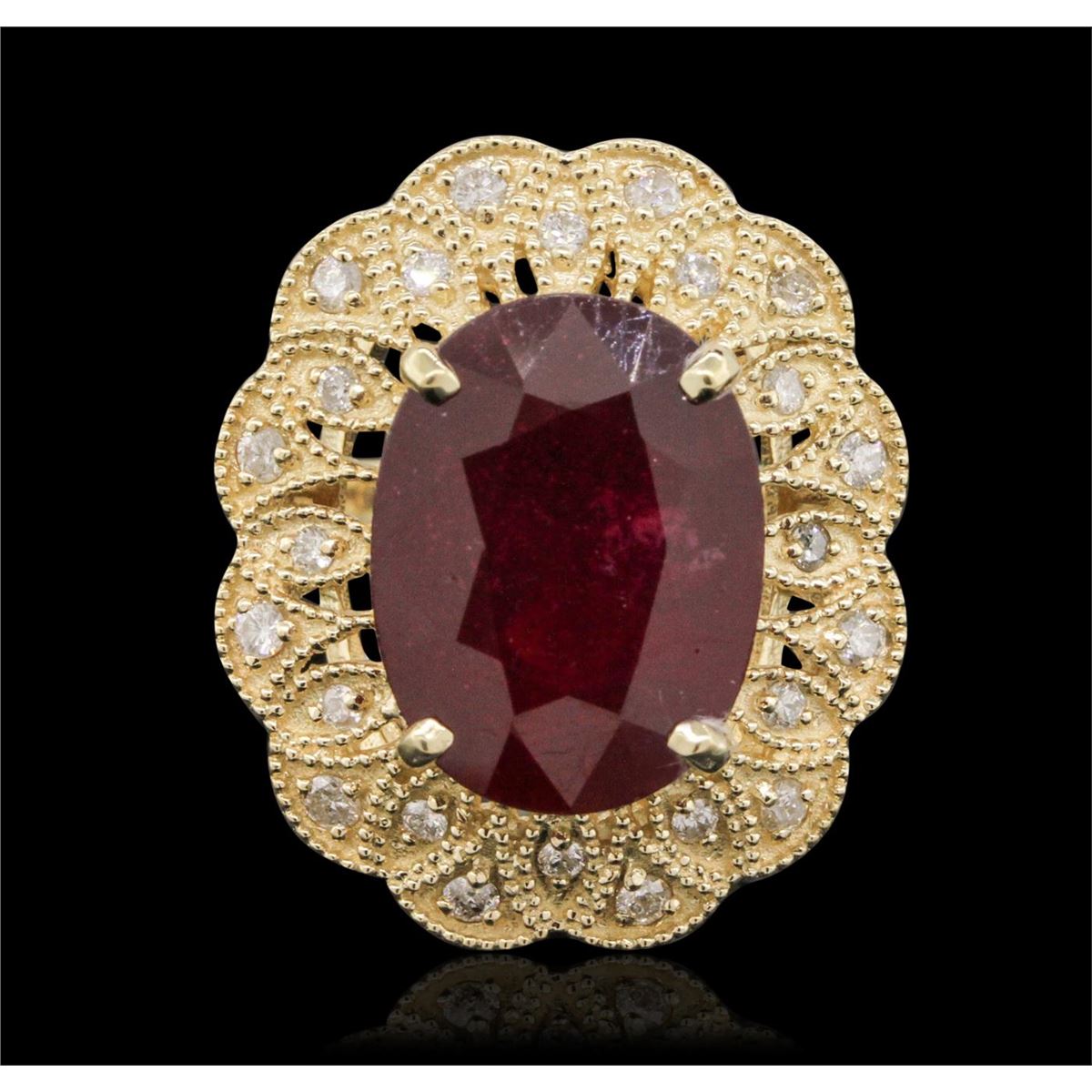 One electronically tested 14KT yellow gold ladies cast ruby and diamond ring. Condition is new, good workmanship. The featured ruby is set within a diamond accented lattice gallery, completed by a two and one-half millimeter wide band. Bright polish finish with milgrain detailing. Identified with markings of "K14". Containing: One prong set oval mixed cut natural ruby, measuring 16.00 x 12.50 x 7.20mm, 8%. bulge factor, approximate weight of 12.63ct., clarity is heavily included, type II, dark, very slightly brownish, slightly purplish red color, (GIA slpR 7/3), cut is good. Transmitting light somewhat diffusely, transparent to translucent. Naturally occurring internal & external characteristics are present. Indications of laboratory high temperature heat treatment, with glass & flux additives. Graded in the setting. Ruby has a low tolerance to rhodium plating, repolishing the surface, & ultrasonic cleaning. Twenty-Four prong set round brilliant cut diamonds, measuring 1.70 - 1.50 x 0.96mm (depth est.) approximate. Total Weight of 24 Stones = 0.45ct. Graded in the setting. Clarity: I-1 to I-2. Color: G - I. Total Weight of Colored Stones 12.63ct. Total Weight of Diamonds 0.45ct. Total Weight of Ring 12.81gm. AIG Appraised at $5,610.00.