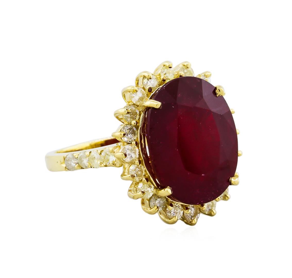 14KT yellow gold ruby and diamond ring. An oval cut ruby corundum gemstone weighing in at an aproximate 12.64 carats is prong mounted in the center of the ring. Approximately 1.15 carats of round brilliant cut diamonds accent the ring around the center gemstones and on both sides. The ring is cast stamped "14K" and has a gross weight of 7.7 grams. The diamond have an average clarity of I1-I2. Ruby color red, intensity is medium. Finish: High polish. Condition: Excellent GGA Appraised at $6,330.00.