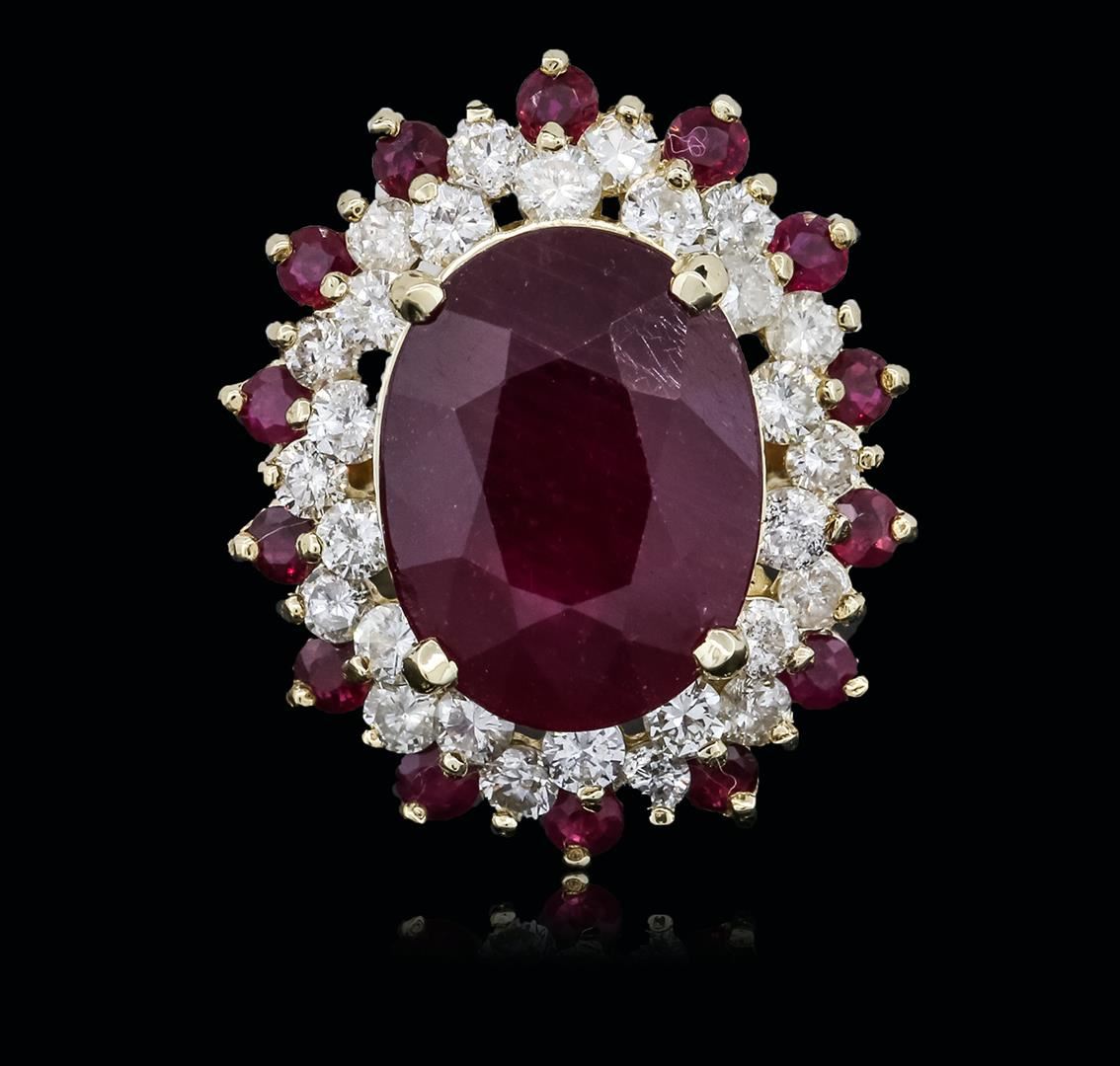 One electronically tested 14KT yellow gold ladies combination cast & assembled ruby and diamond ring with a bright polish finish. Identified with markings of "K14". Condition is new. Containing: One prong set oval modified brilliant cut natural ruby, measuring 15.26 x 11.76 x 7.64mm, approximate weight of 11.66ct., clarity is heavily included, medium dark, moderately strong, strongly purplish red color, (GIA stpR 6/4), cut is good. Fourteen prong set round modified brilliant cut natural rubies, measuring 2.50 - 2.50 x 1.63 mm, approximate total weight of 1.12ct., clarity is heavily included, medium dark, moderately strong, strongly purplish red color, (GIA stpR 6/4), cut is good. Twenty-Eight prong set round brilliant cut diamonds, measuring 2.40 - 2.40 x 1.44mm (depth est.) approximate total weight of 28 Stones = 1.42ct. Clarity: SI-2 to I-1. Color: J - K, Cut is Good. Colored gemstones are presumed to have been subjected to commonly used enhancement processes. All diamonds and colored gemstones are graded in the mounting, unless otherwise stated. Total Weight of Colored Stones 12.78ct. Total Weight of Diamonds 1.42ct. Total Weight of Ring 10.80 grams. GGL Appraised at $6,725.00.