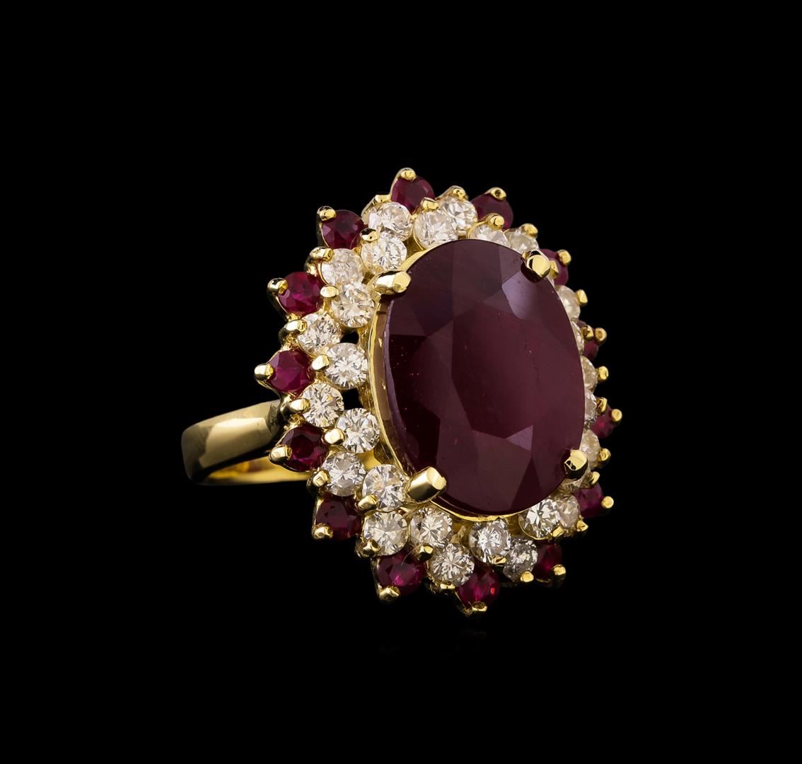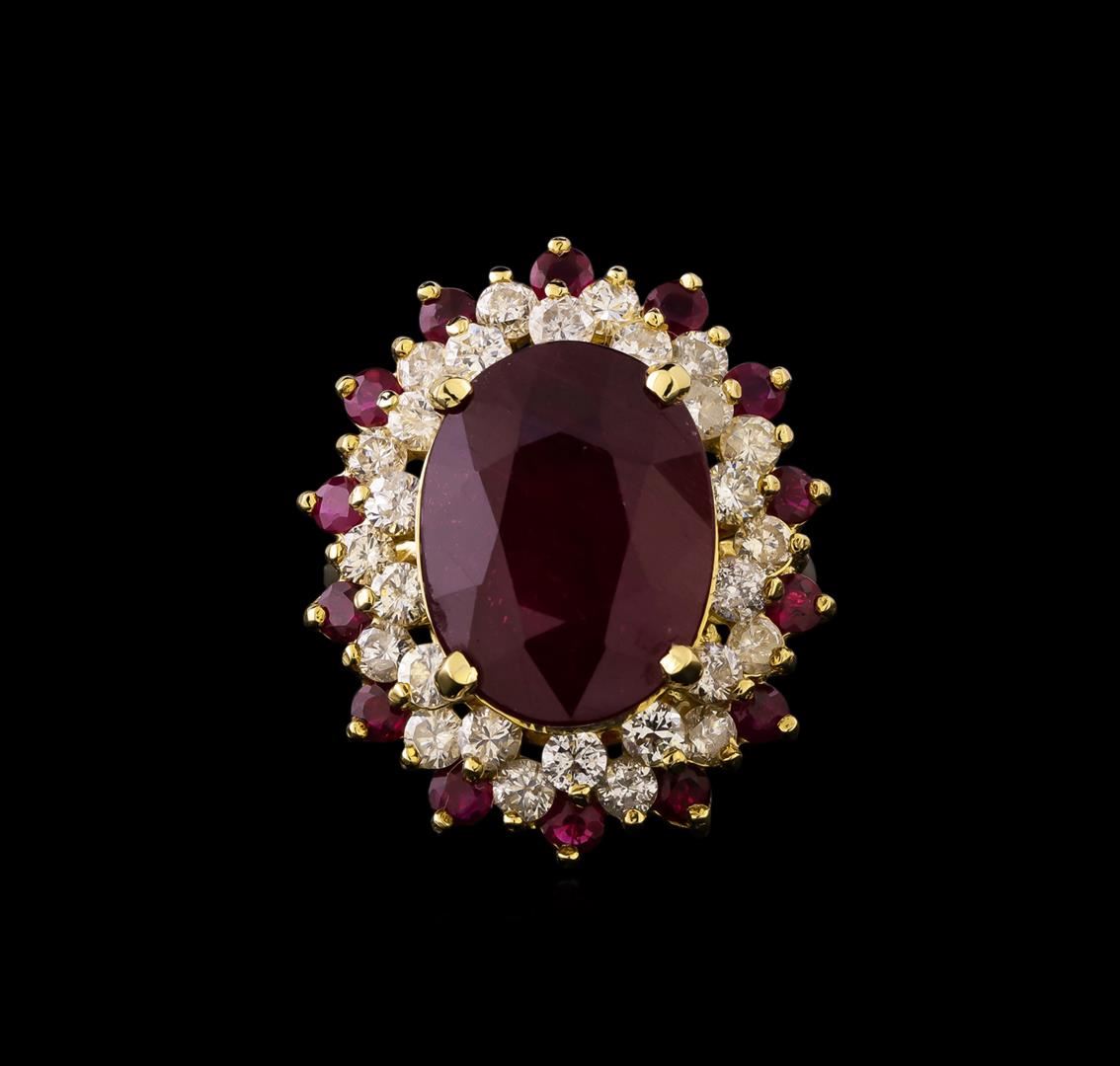 One electronically tested 14KT yellow gold ladies combination cast & assembled ruby and diamond ring with a bright polish finish. Identified with markings of "K14". Condition is new. Containing: One prong set oval modified brilliant cut natural ruby, measuring 15.26 x 11.76 x 7.64mm, approximate weight of 11.66ct., clarity is heavily included, medium dark, moderately strong, strongly purplish red color, (GIA stpR 6/4), cut is good. Fourteen prong set round modified brilliant cut natural rubies, measuring 2.50 - 2.50 x 1.63 mm, approximate total weight of 1.12ct., clarity is heavily included, medium dark, moderately strong, strongly purplish red color, (GIA stpR 6/4), cut is good. Twenty-Eight prong set round brilliant cut diamonds, measuring 2.40 - 2.40 x 1.44mm (depth est.) approximate total weight of 28 Stones = 1.42ct. Clarity: SI-2 to I-1. Color: J - K, Cut is Good. Colored gemstones are presumed to have been subjected to commonly used enhancement processes. All diamonds and colored gemstones are graded in the mounting, unless otherwise stated. Total Weight of Colored Stones 12.78ct. Total Weight of Diamonds 1.42ct. Total Weight of Ring 10.80 grams. GGL Appraised at $6,725.00.