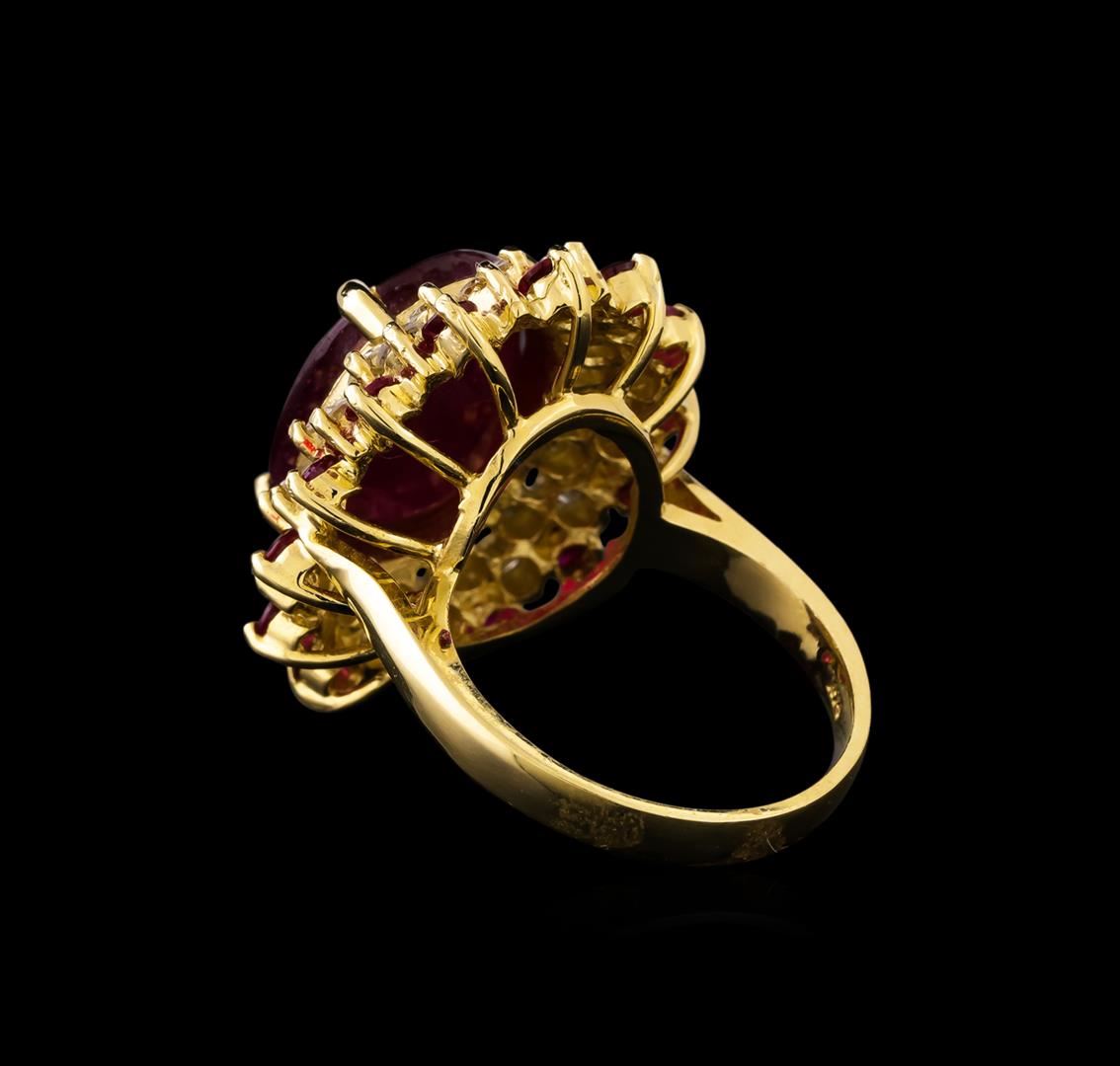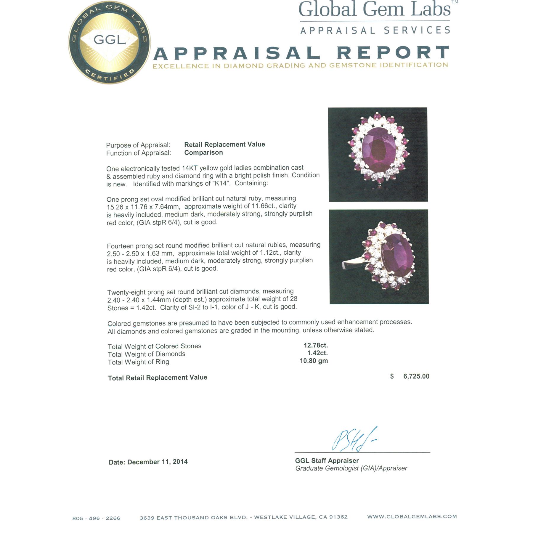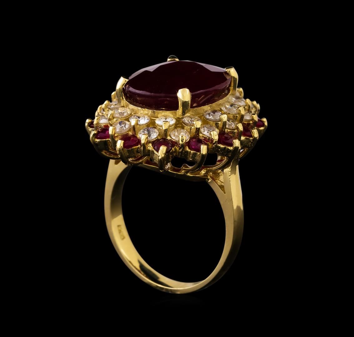 One electronically tested 14KT yellow gold ladies combination cast & assembled ruby and diamond ring with a bright polish finish. Identified with markings of "K14". Condition is new. Containing: One prong set oval modified brilliant cut natural ruby, measuring 15.26 x 11.76 x 7.64mm, approximate weight of 11.66ct., clarity is heavily included, medium dark, moderately strong, strongly purplish red color, (GIA stpR 6/4), cut is good. Fourteen prong set round modified brilliant cut natural rubies, measuring 2.50 - 2.50 x 1.63 mm, approximate total weight of 1.12ct., clarity is heavily included, medium dark, moderately strong, strongly purplish red color, (GIA stpR 6/4), cut is good. Twenty-Eight prong set round brilliant cut diamonds, measuring 2.40 - 2.40 x 1.44mm (depth est.) approximate total weight of 28 Stones = 1.42ct. Clarity: SI-2 to I-1. Color: J - K, Cut is Good. Colored gemstones are presumed to have been subjected to commonly used enhancement processes. All diamonds and colored gemstones are graded in the mounting, unless otherwise stated. Total Weight of Colored Stones 12.78ct. Total Weight of Diamonds 1.42ct. Total Weight of Ring 10.80 grams. GGL Appraised at $6,725.00.