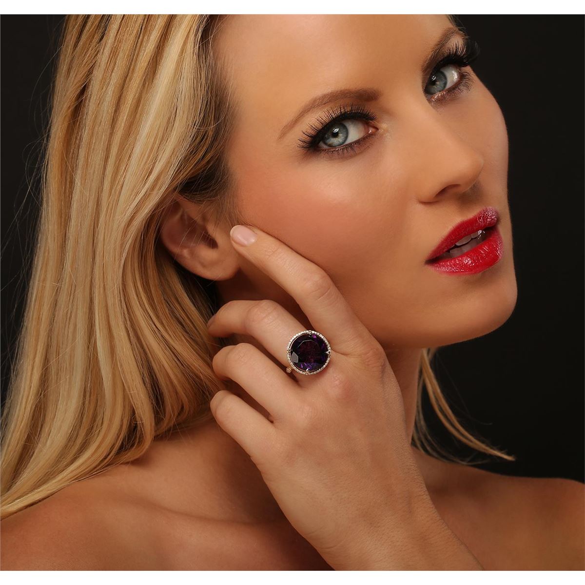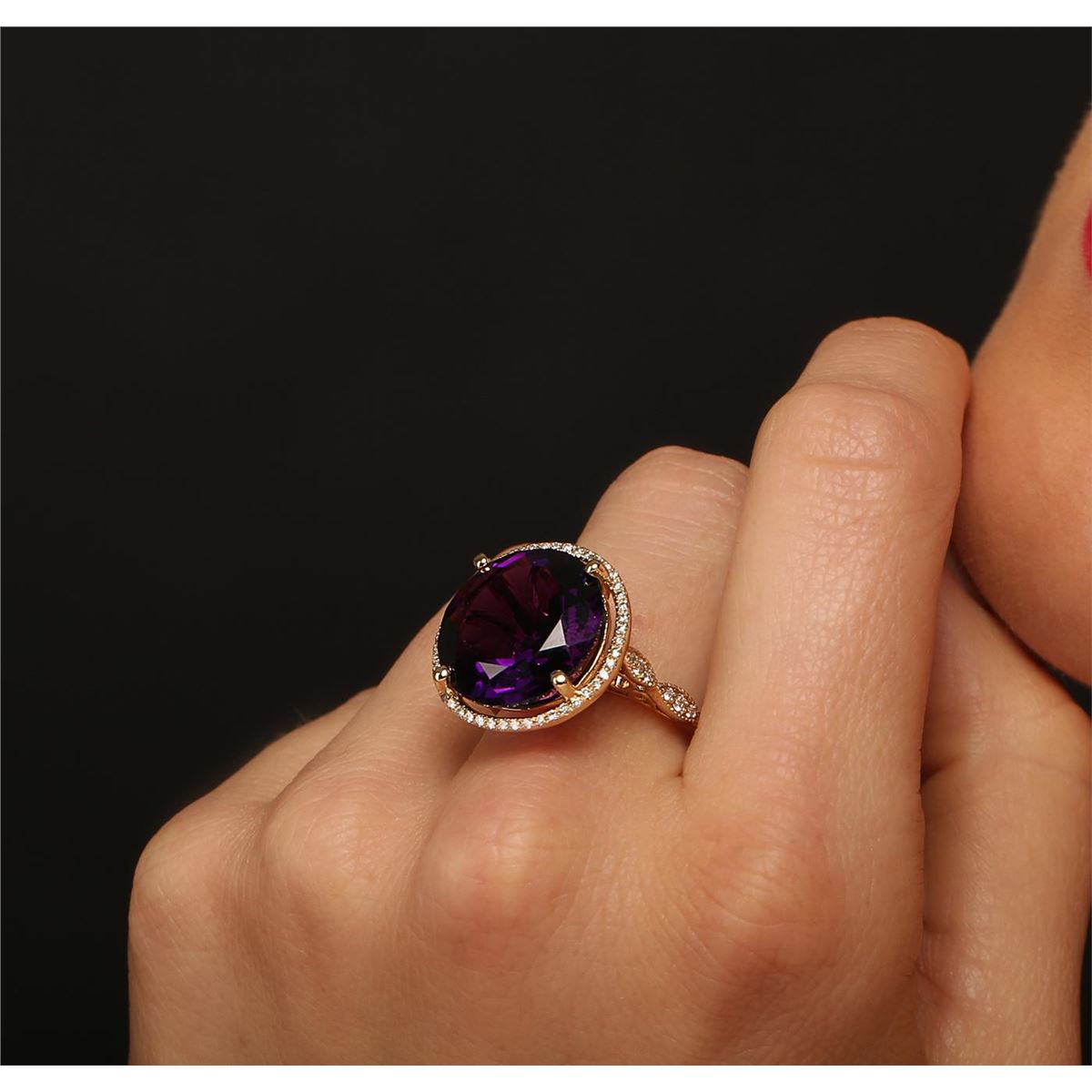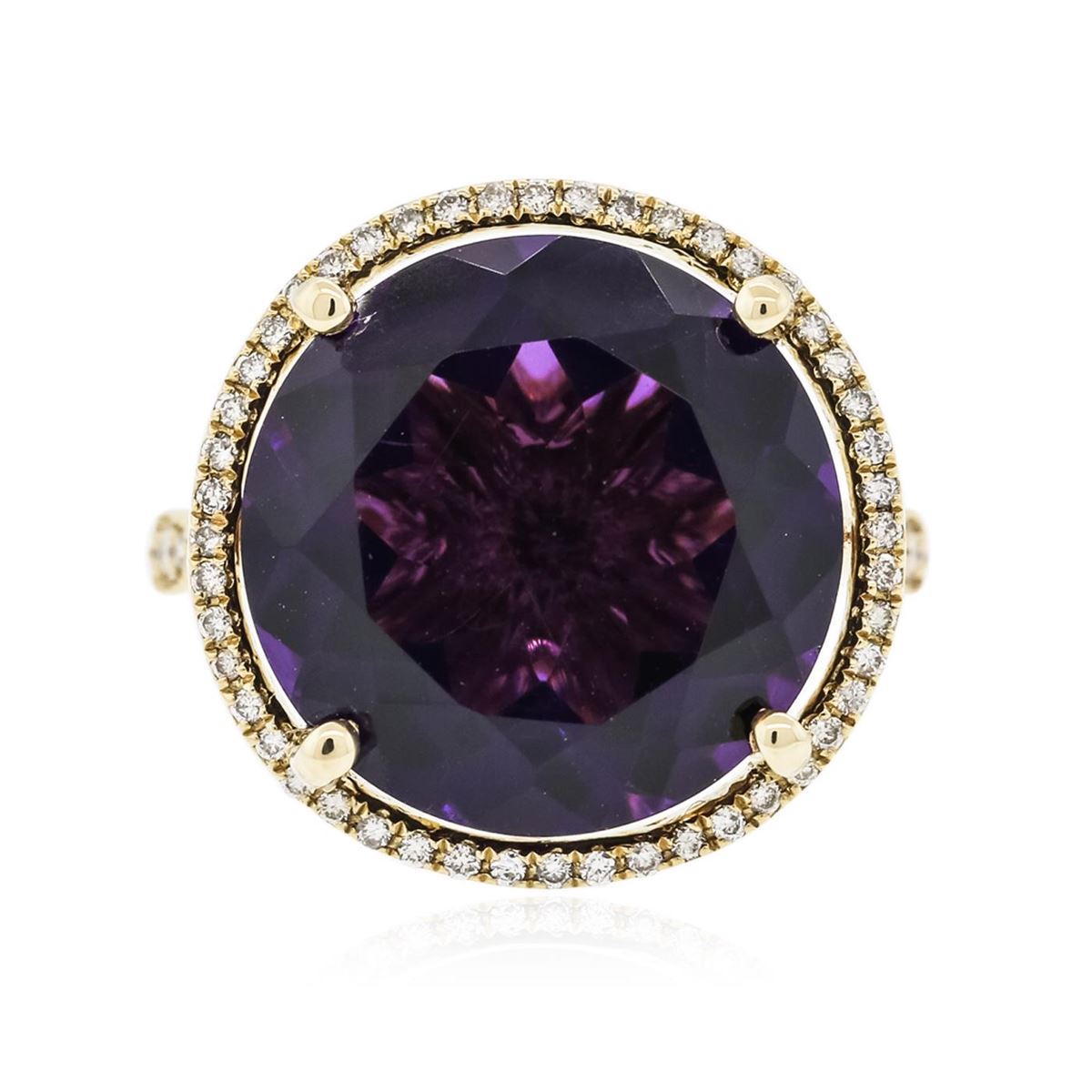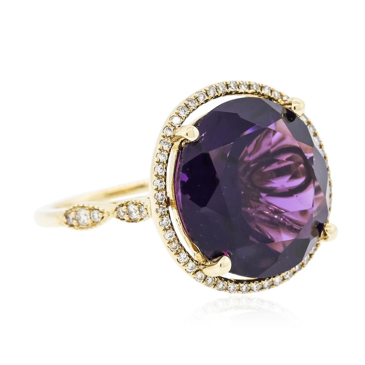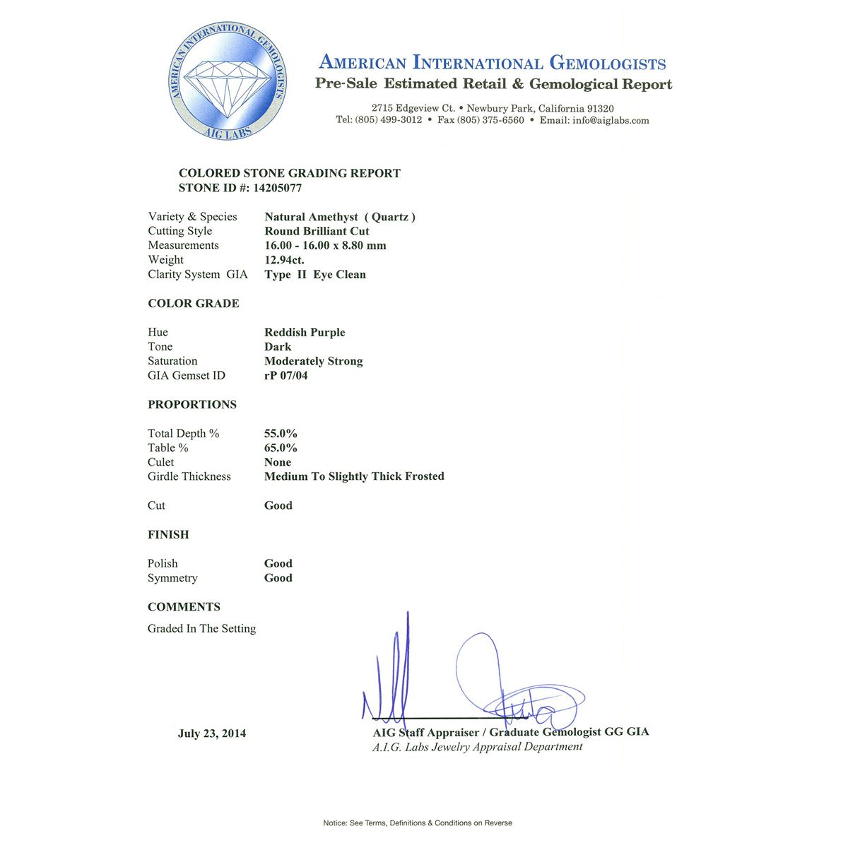 One electronically tested 14KT yellow gold ladies cast amethyst and diamond ring. Condition is new, good workmanship. The featured amethyst is set within a diamond bezel supported by diamond set shoulders, completed by a one and one-half millimeter wide band. Bright polish finish with milgrain detailing. Trademark is PMI. Identified with markings of "14K". Containing: One prong set round brilliant cut natural amethyst, measuring 16.00 - 16.00 x 8.80 mm, 8%. bulge factor, approximate weight of 12.94ct., clarity is eye clean, type II, dark, moderately strong, reddish purple color, (GIA rP 7/4), cut is good. Transmitting light with no distortion, transparent. Refractive index testing results of 1.54 to 1.55. This is a conclusive result for quartz (amethyst). Colored Stone Grading Report attached. Graded in the setting. Sixty-One prong set round brilliant cut diamonds, measuring 1.60 - 1.10 x 0.81mm (depth est.) approximate. Total Weight of 61 Stones = 0.65ct. Graded in the setting. Clarity: SI-2 to I-1. Color: G - I. Total Weight of Colored Stones 12.94ct. Total Weight of Diamonds 0.65ct. Total Weight of Ring 8.06 grams. AIG Appraised at $3,805.00.